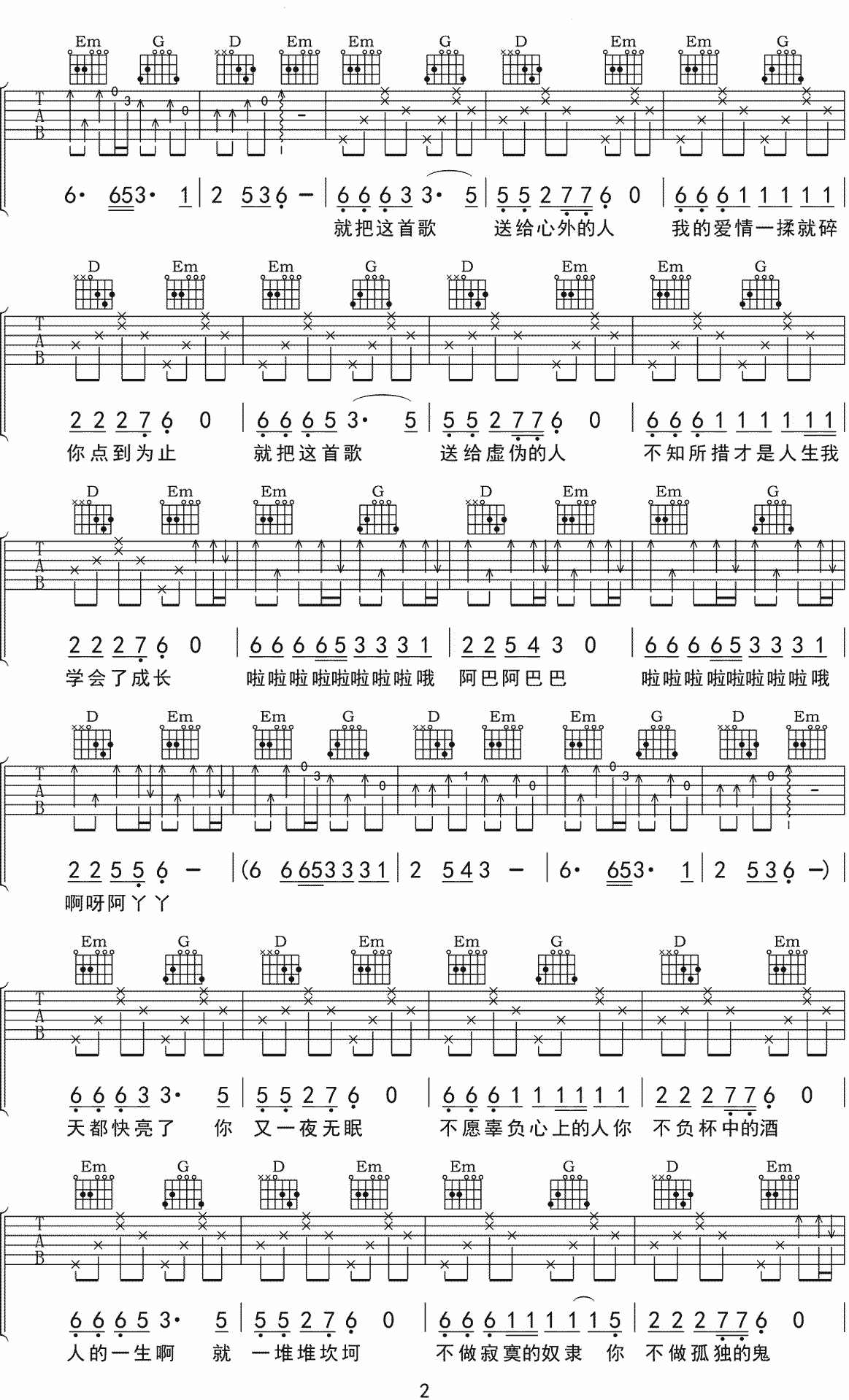 《单身情歌》高清吉他六线谱吉他谱