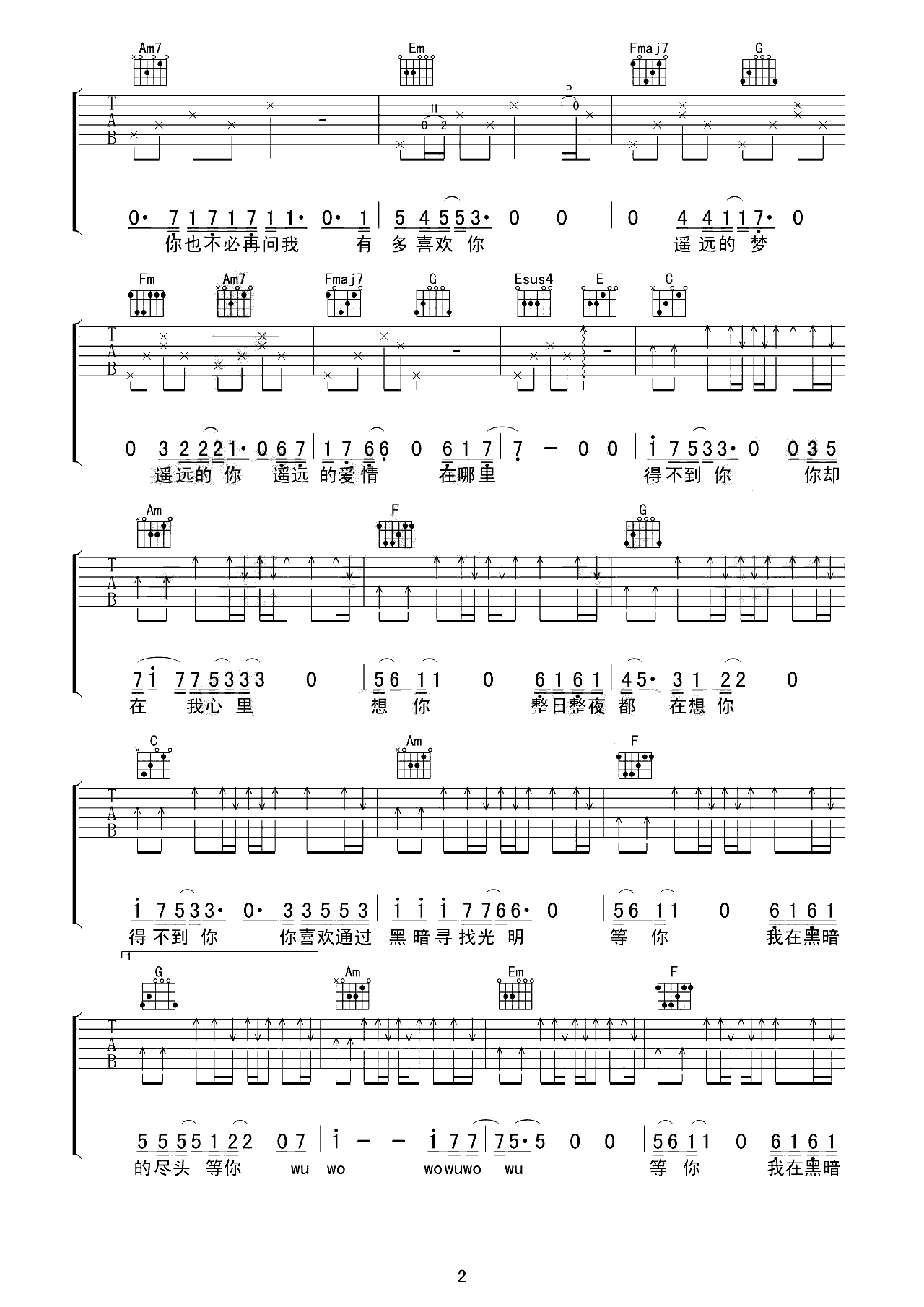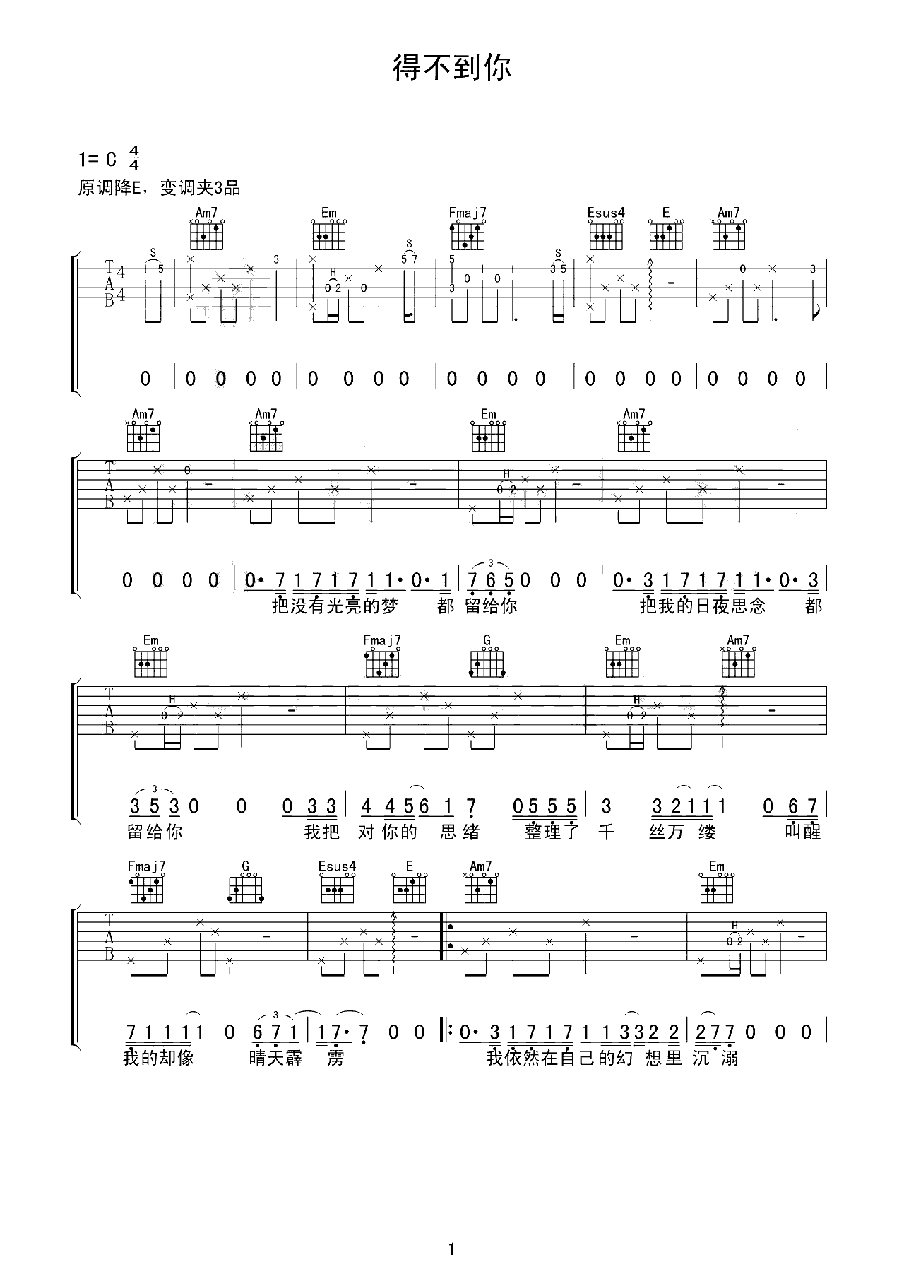 吉他谱 | 热门弹唱《得不到你》