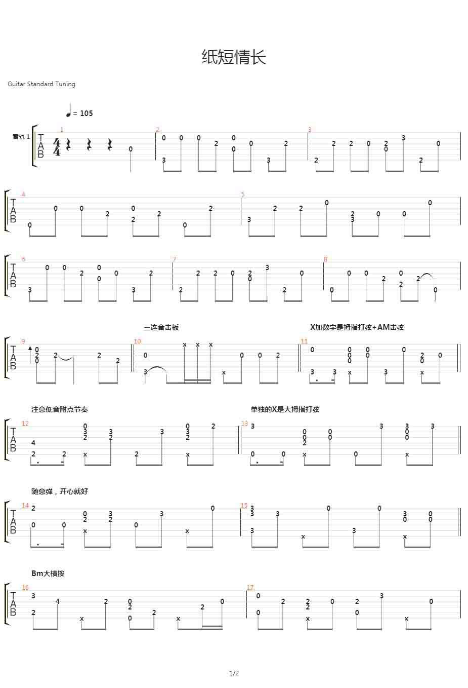 吉他谱 | 经典指弹《纸短情长》