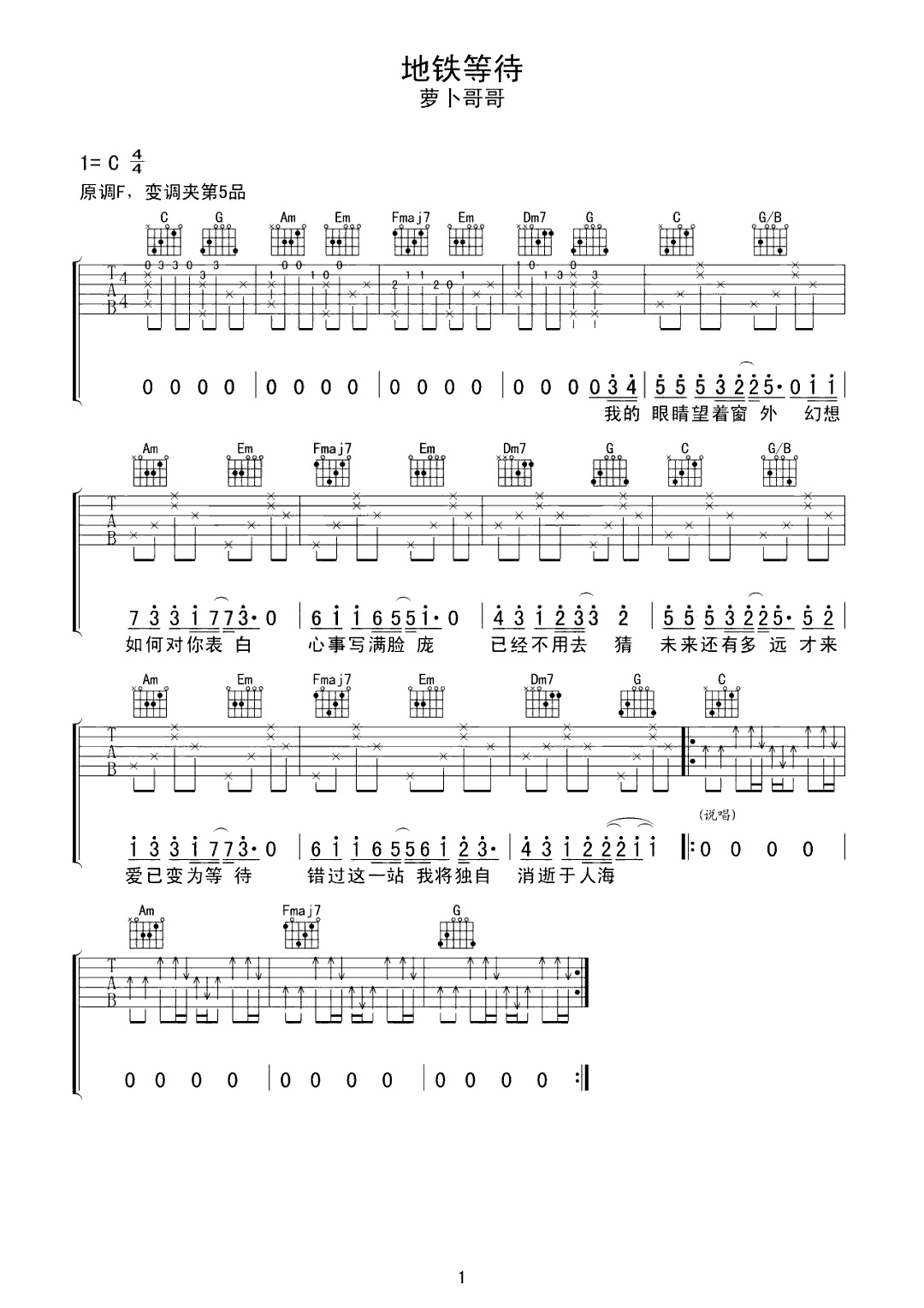 吉他谱 | 热门弹唱《地铁等待》