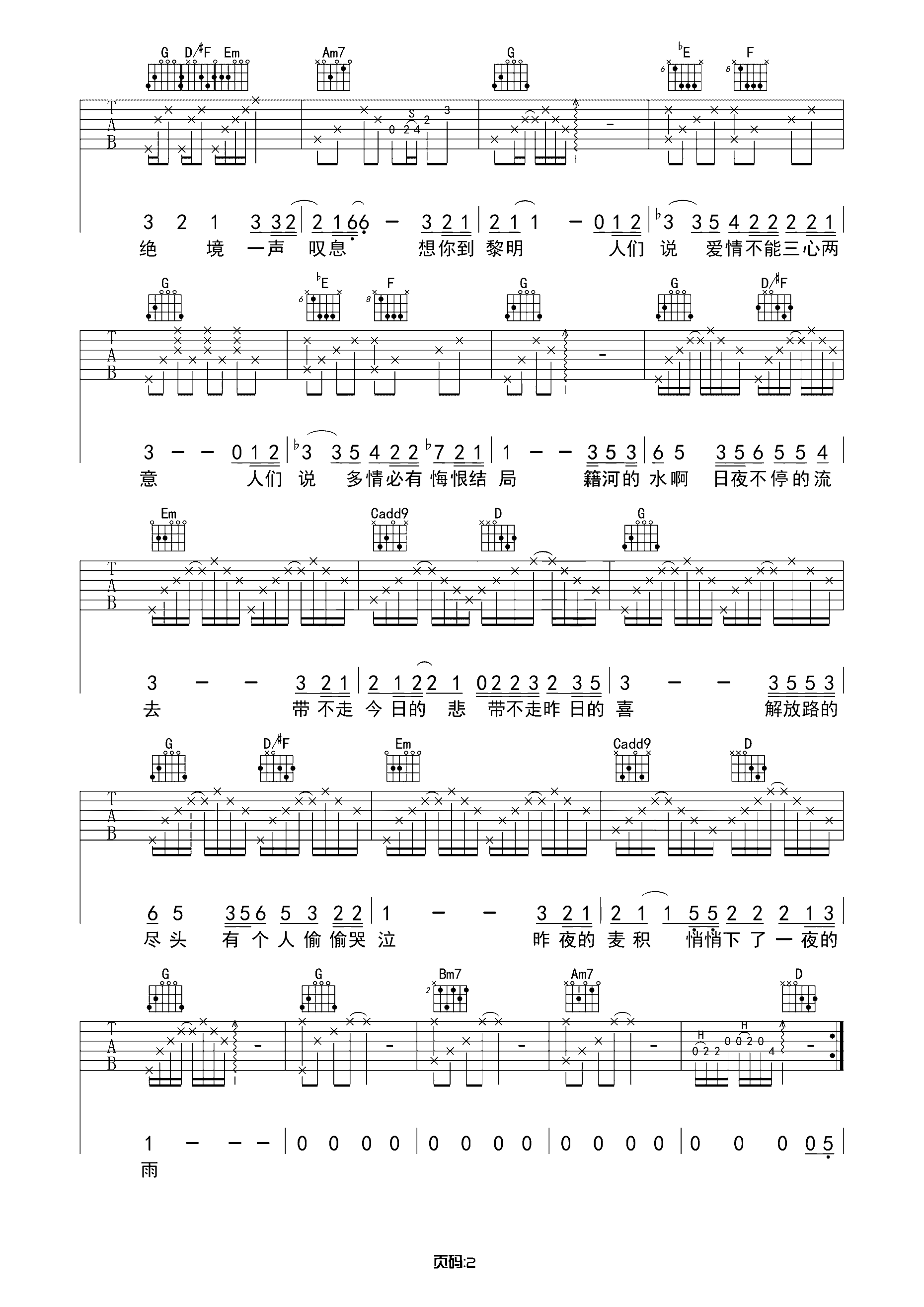 花粥《一首情歌》吉他谱 G调弹唱谱 带