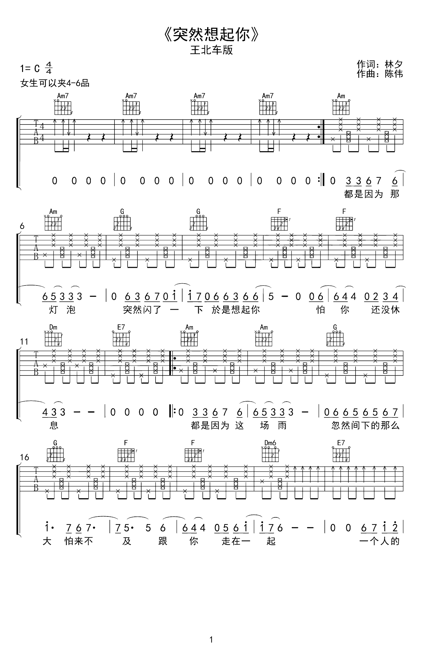 吉他谱 | 热门弹唱《突然想起你》
