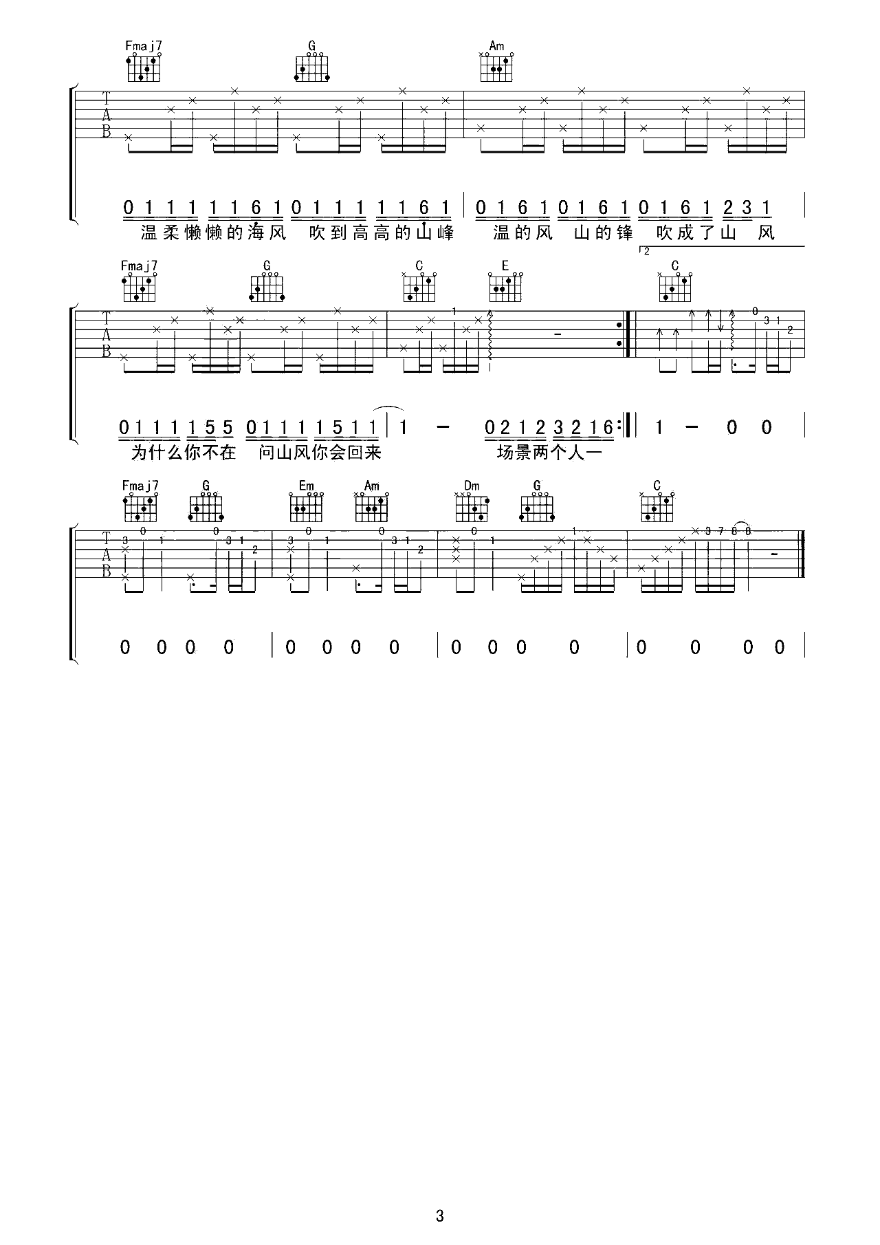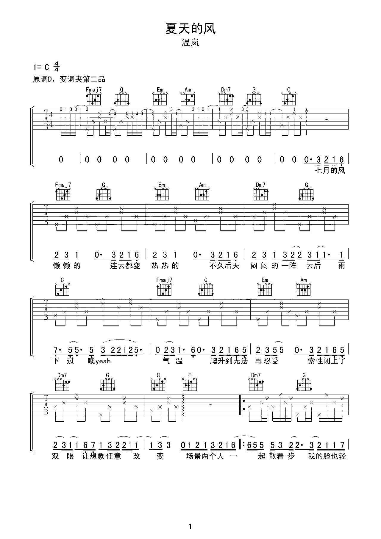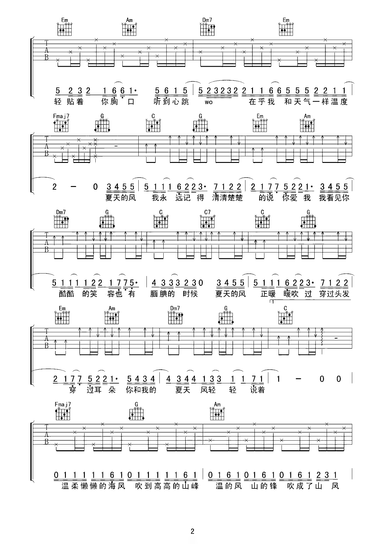 吉他谱 | 热门弹唱《夏天的风》