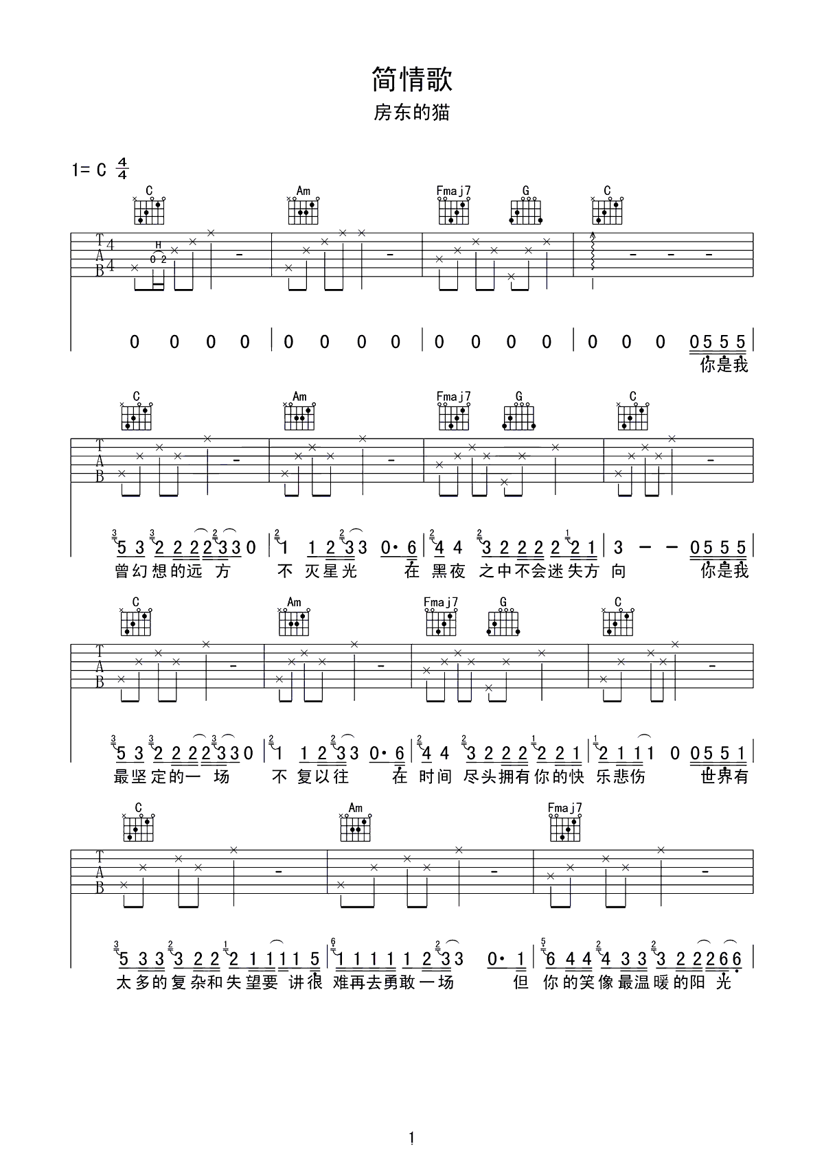 赵雷《成都》吉他谱 C调原版六线谱 高