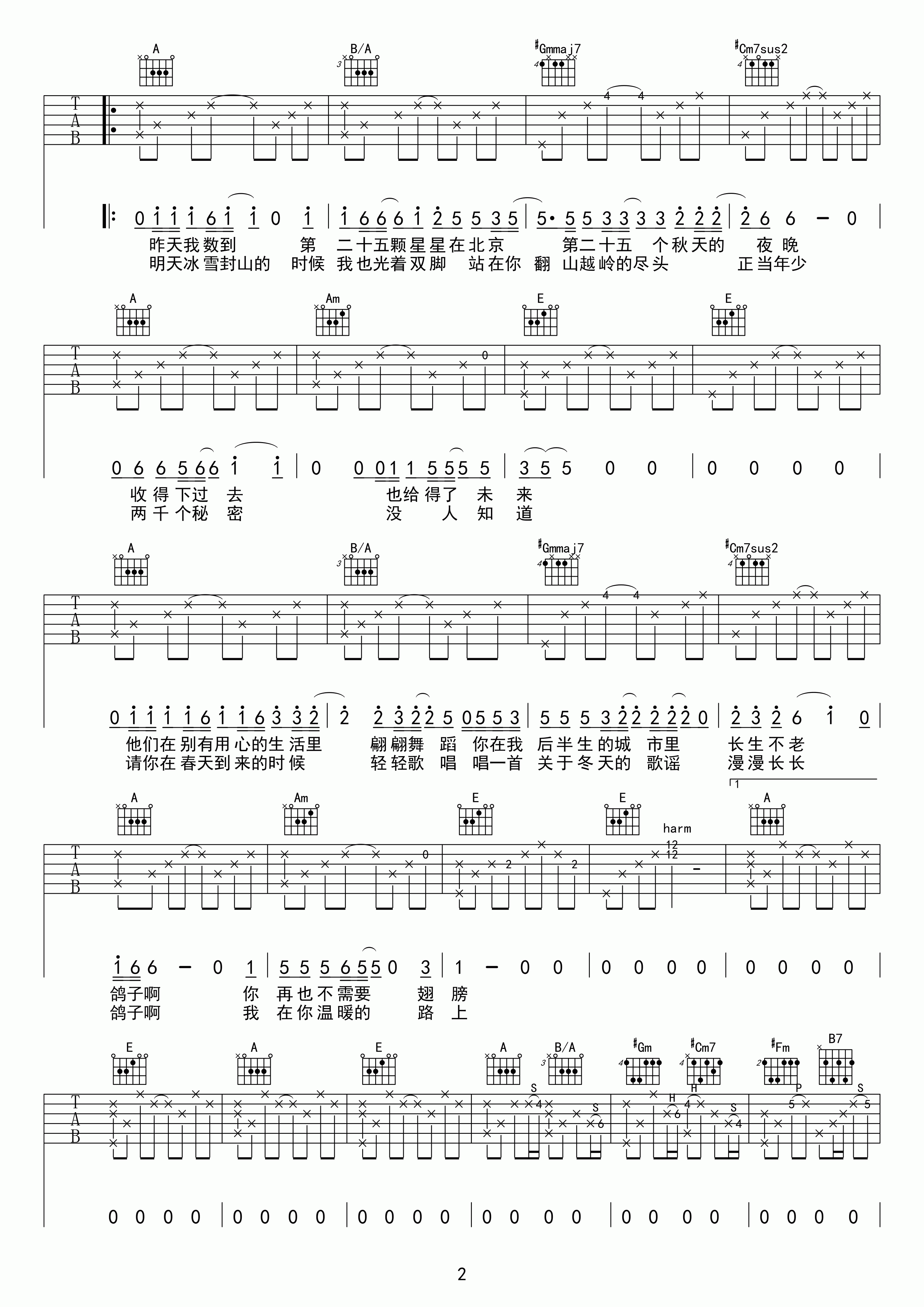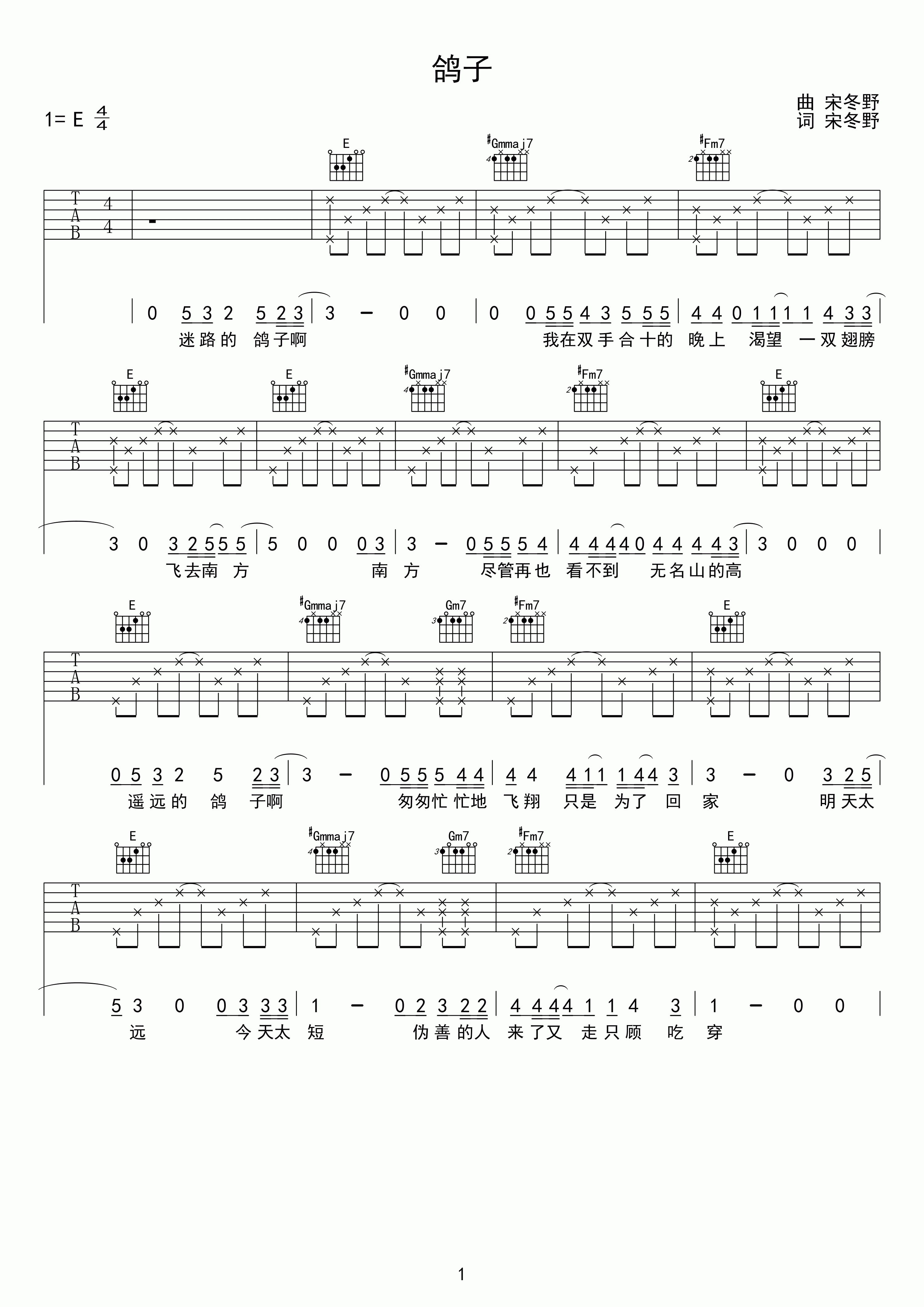 吉他谱 | 宋冬野《鸽子》