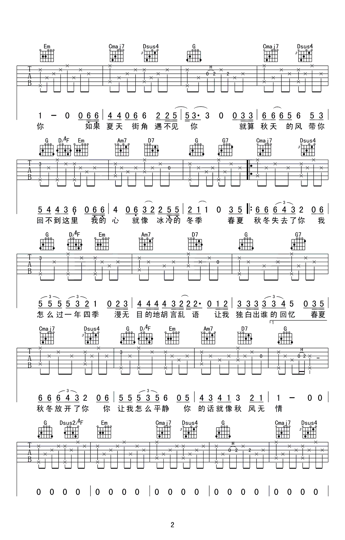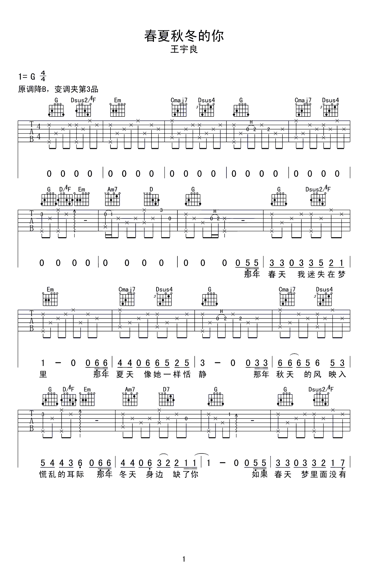 吉他谱 | 热门弹唱《春夏秋冬的你》