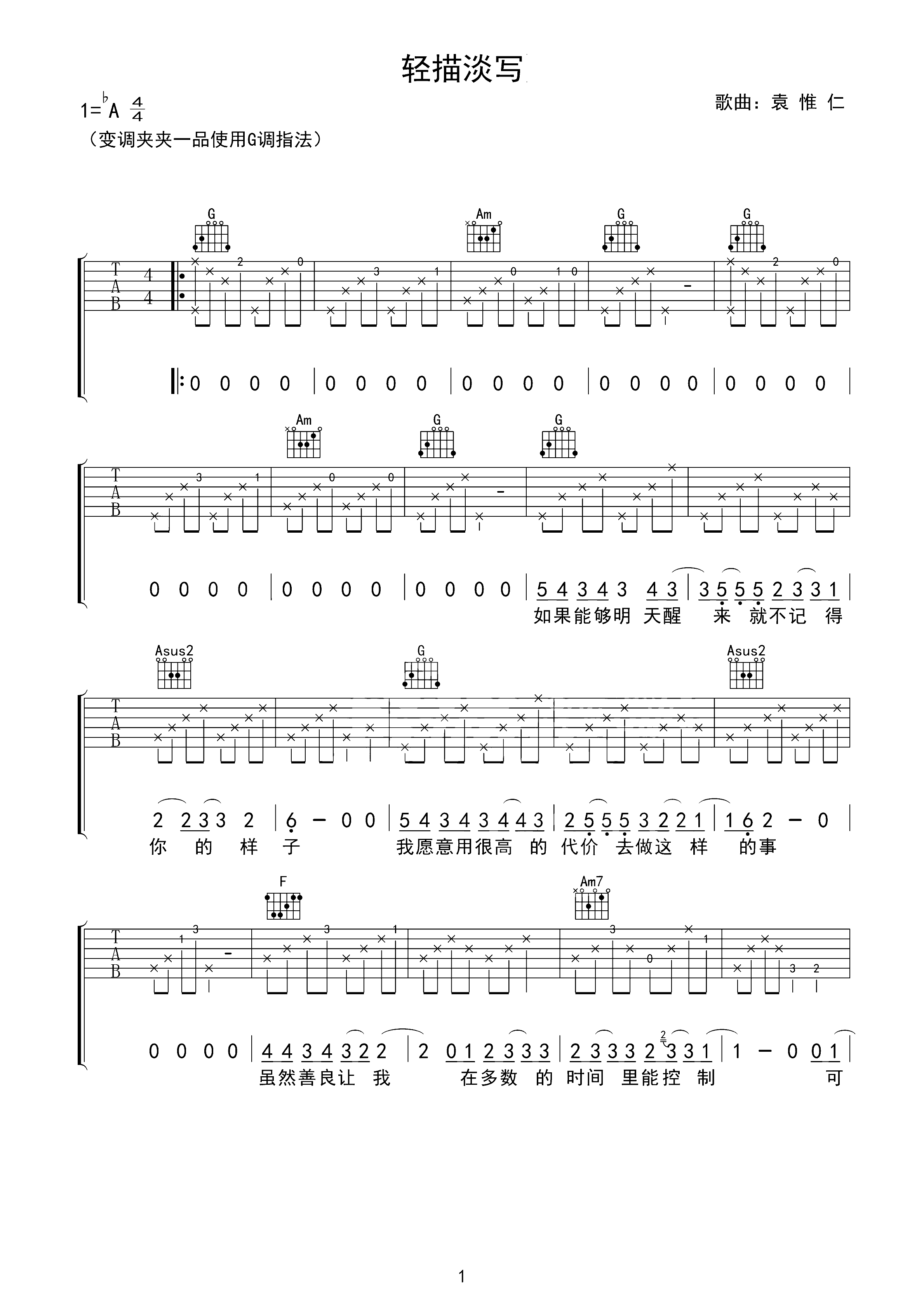 吉他谱 | 热门弹唱《轻描淡写》