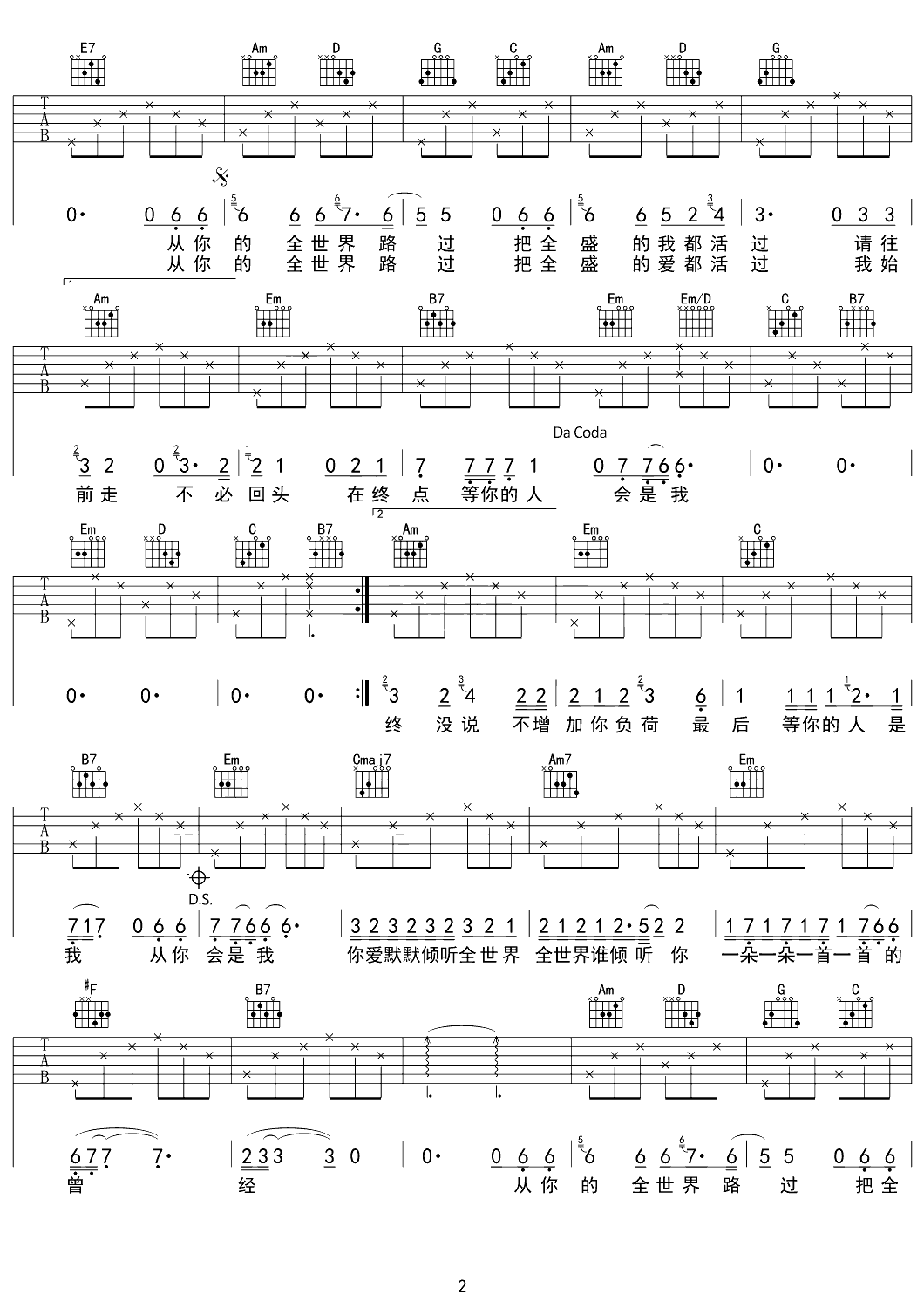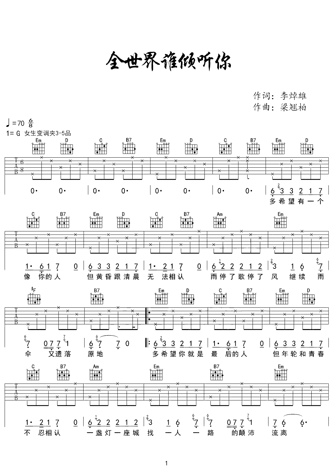 吉他谱 | 热门弹唱《全世界谁倾听你》
