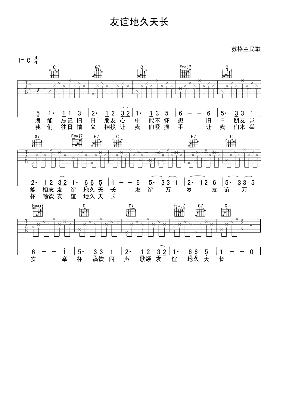 吉他谱 | 入门弹唱《友谊地久天长》