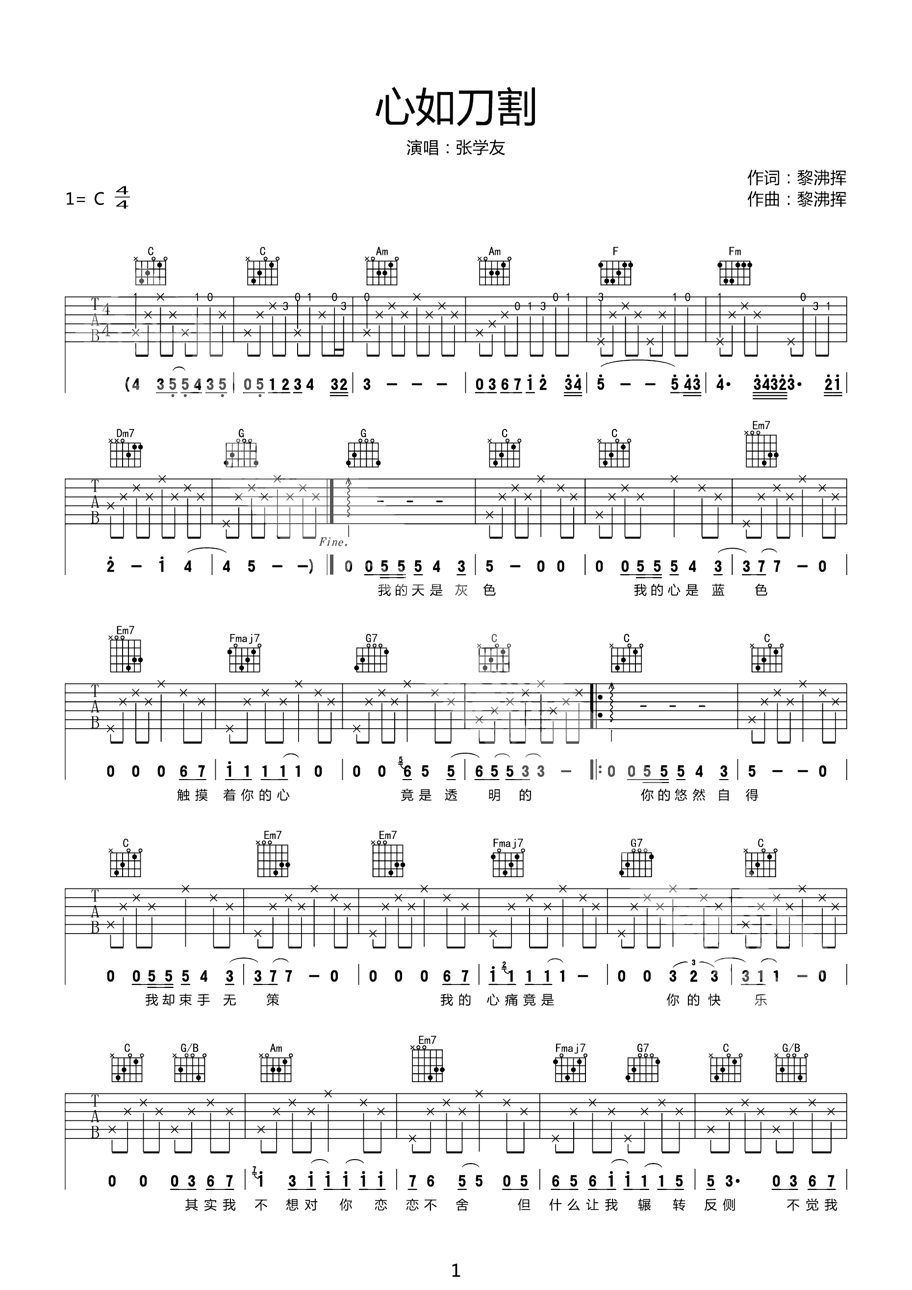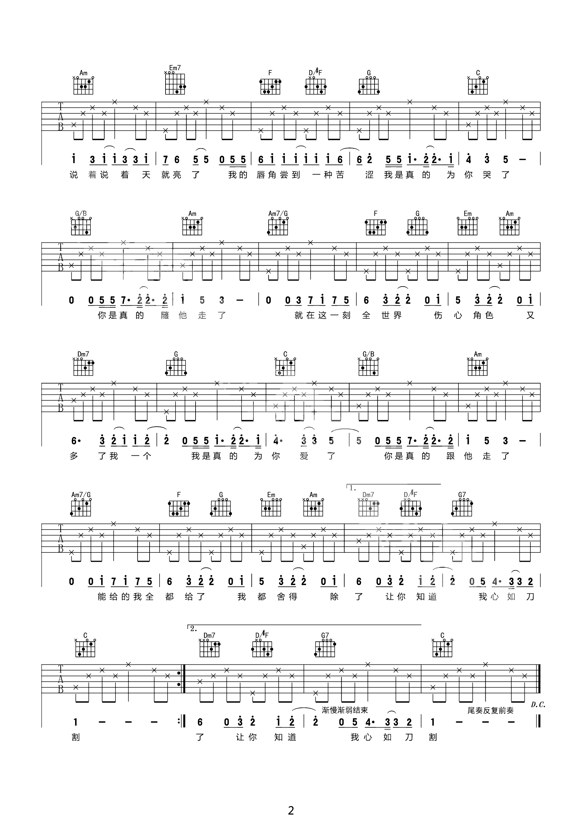 吉他谱 | 热门弹唱《心如刀割》