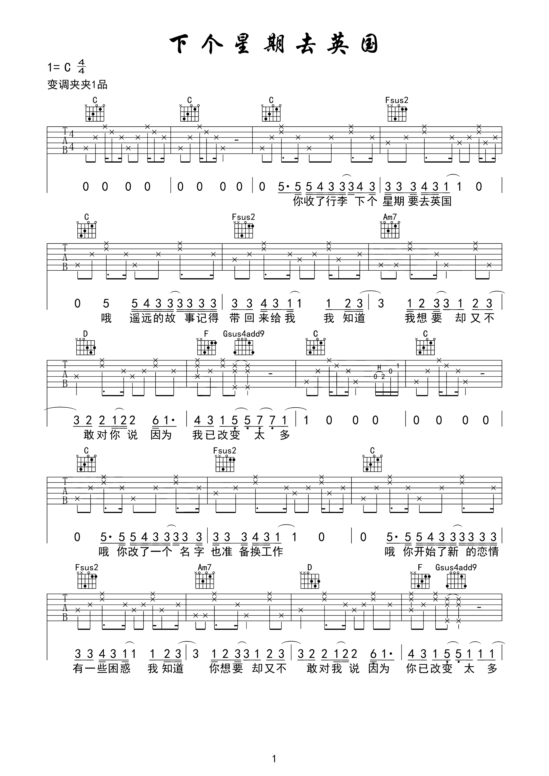 吉他谱 | 热门弹唱《下个星期去英国》