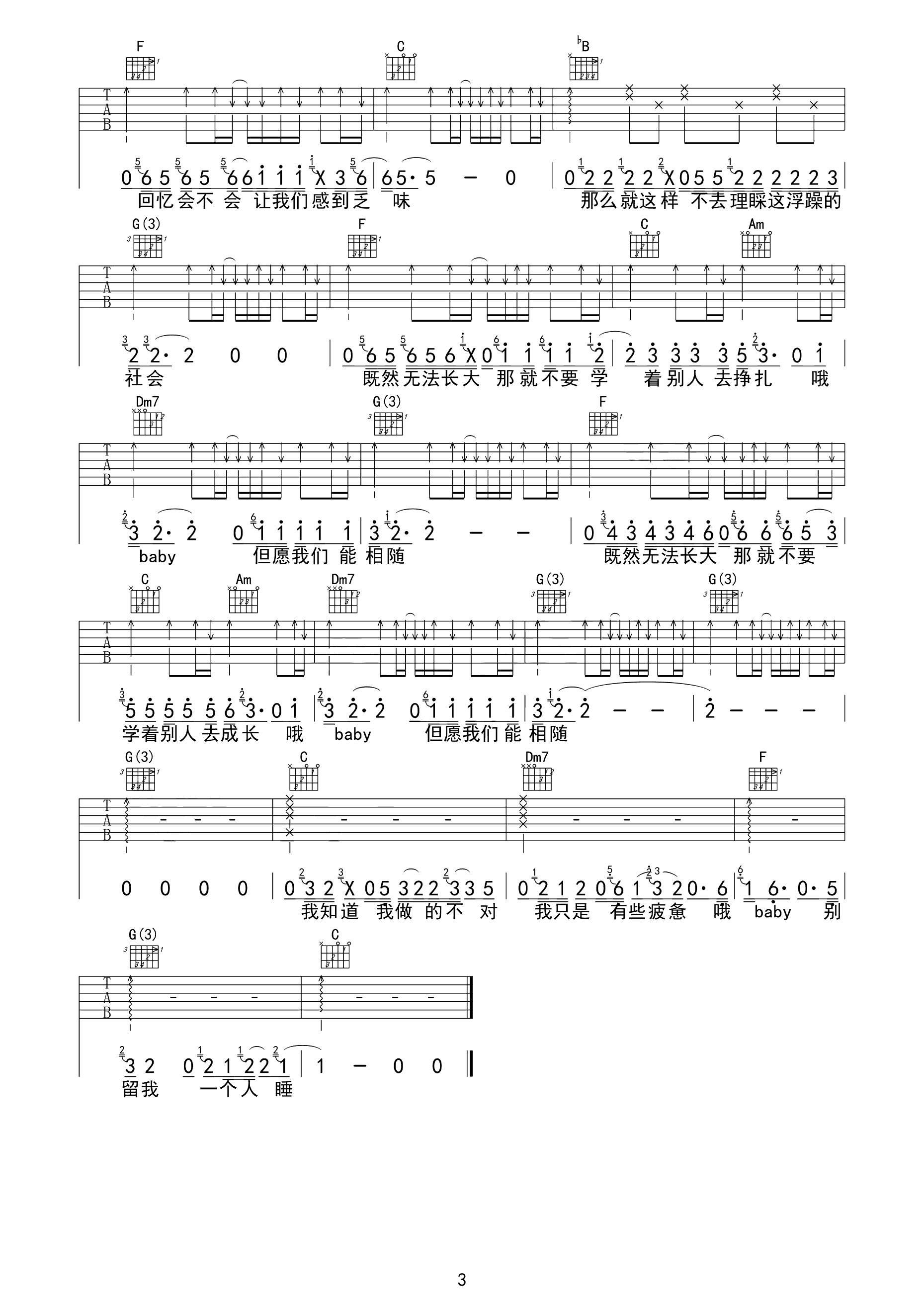 差三岁吉他谱 JAM G调指法 弹唱六线谱