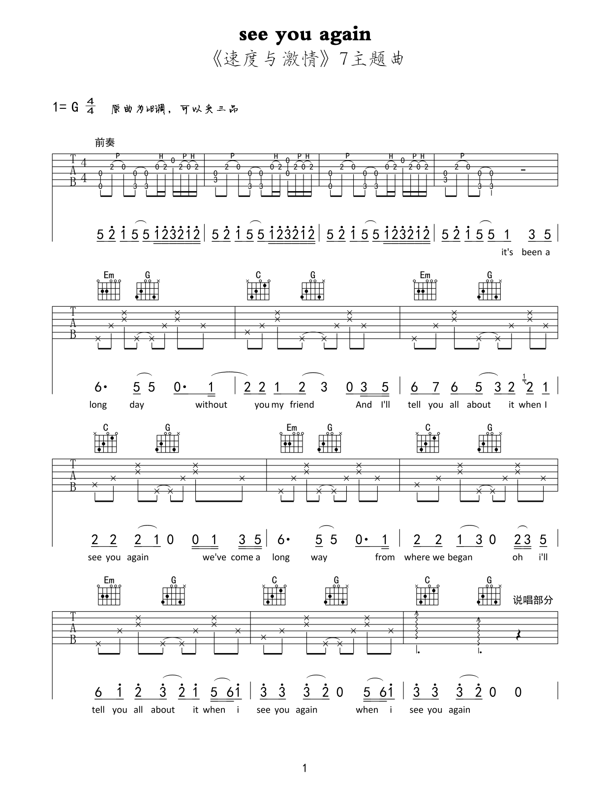 吉他谱 | 热门弹唱《see you again》