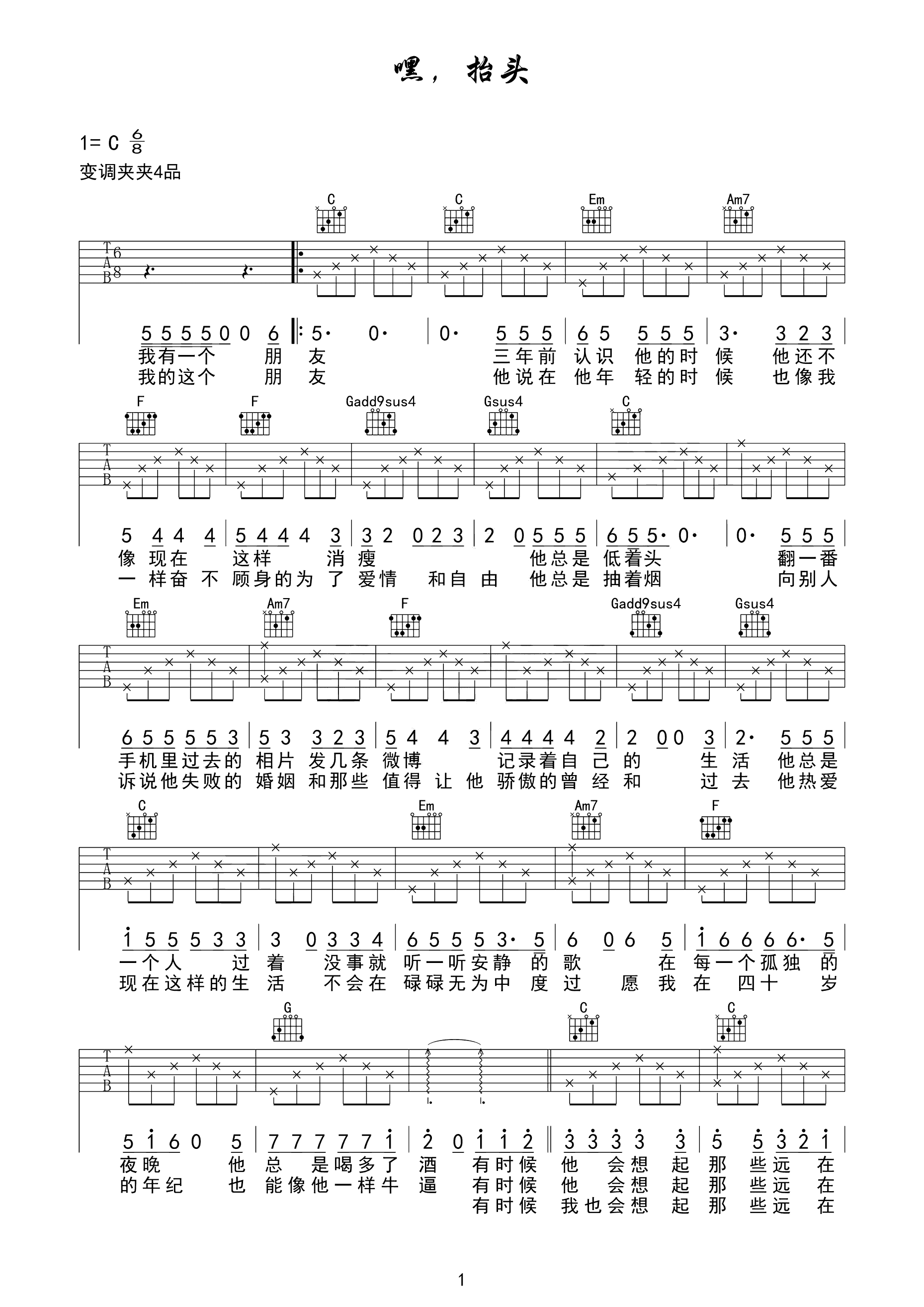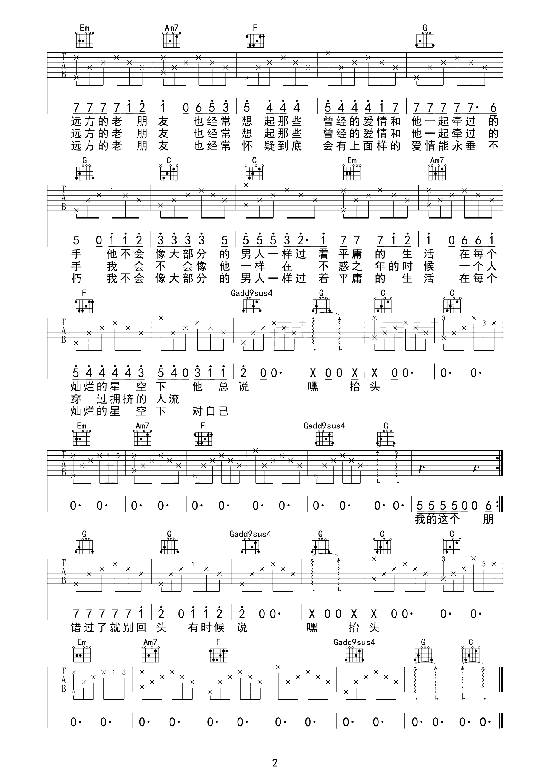 往后余生吉他谱C调 马良 原版弹唱谱 六