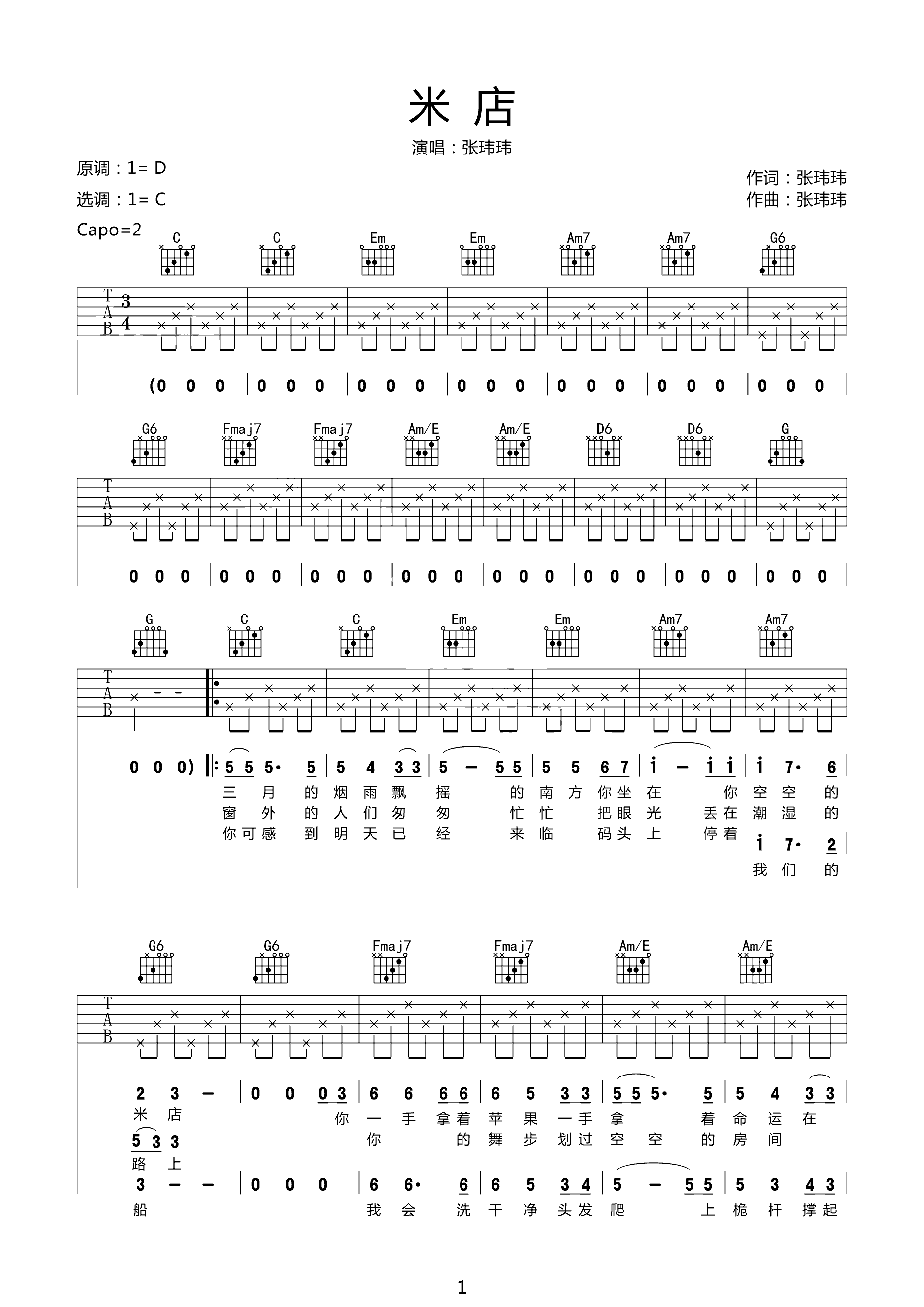 吉他谱 | 入门弹唱《米店》