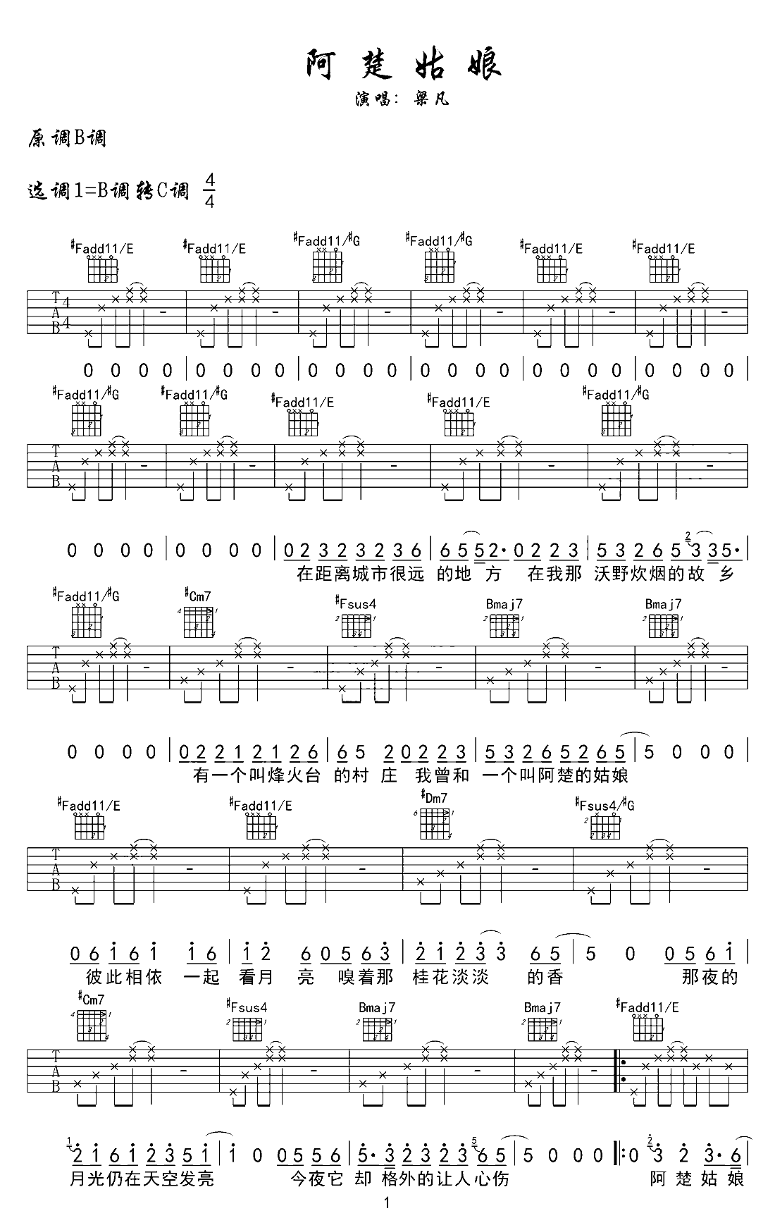 吉他谱 | 热门弹唱《阿楚姑娘》