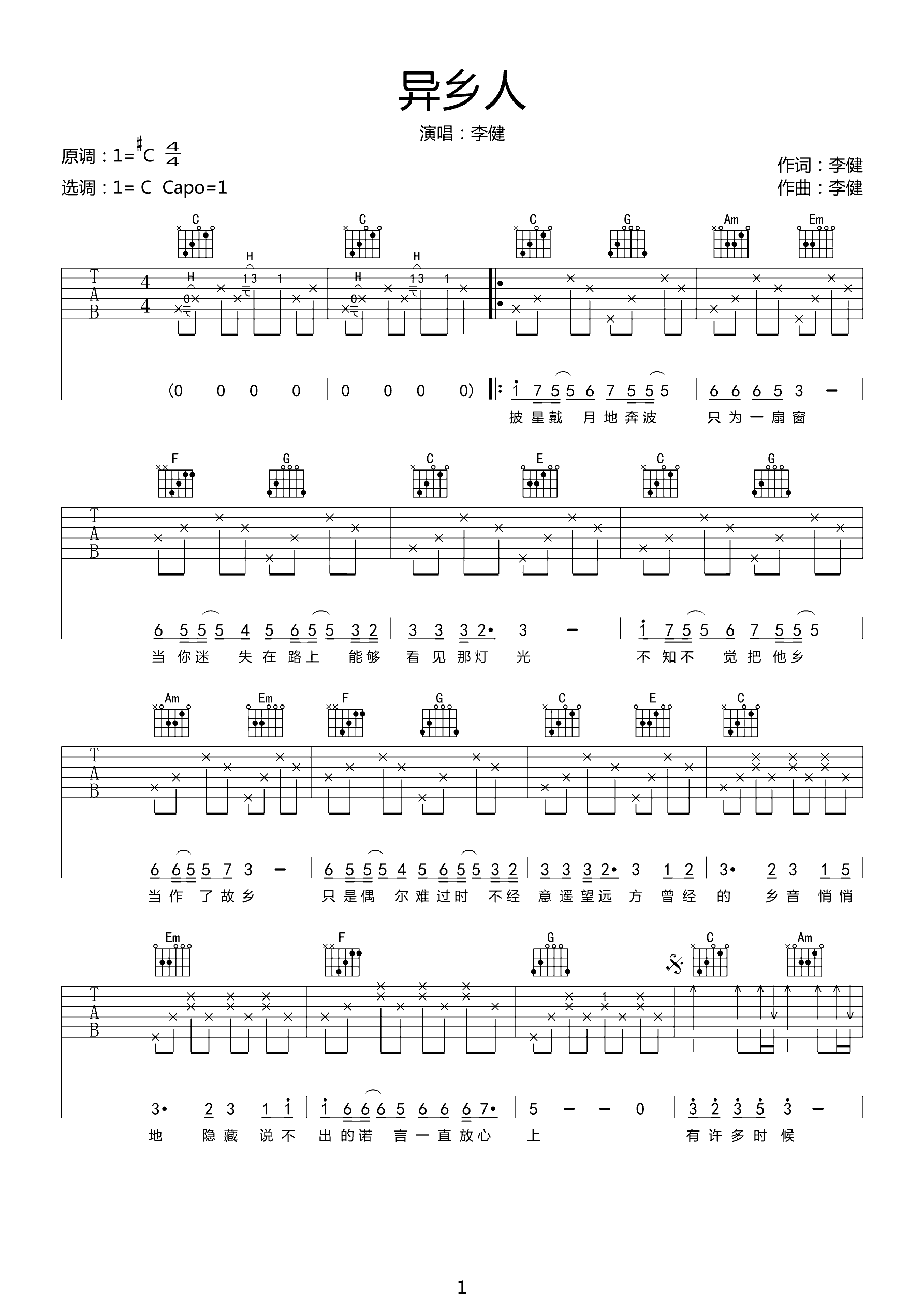 吉他谱 | 热门弹唱《异乡人》
