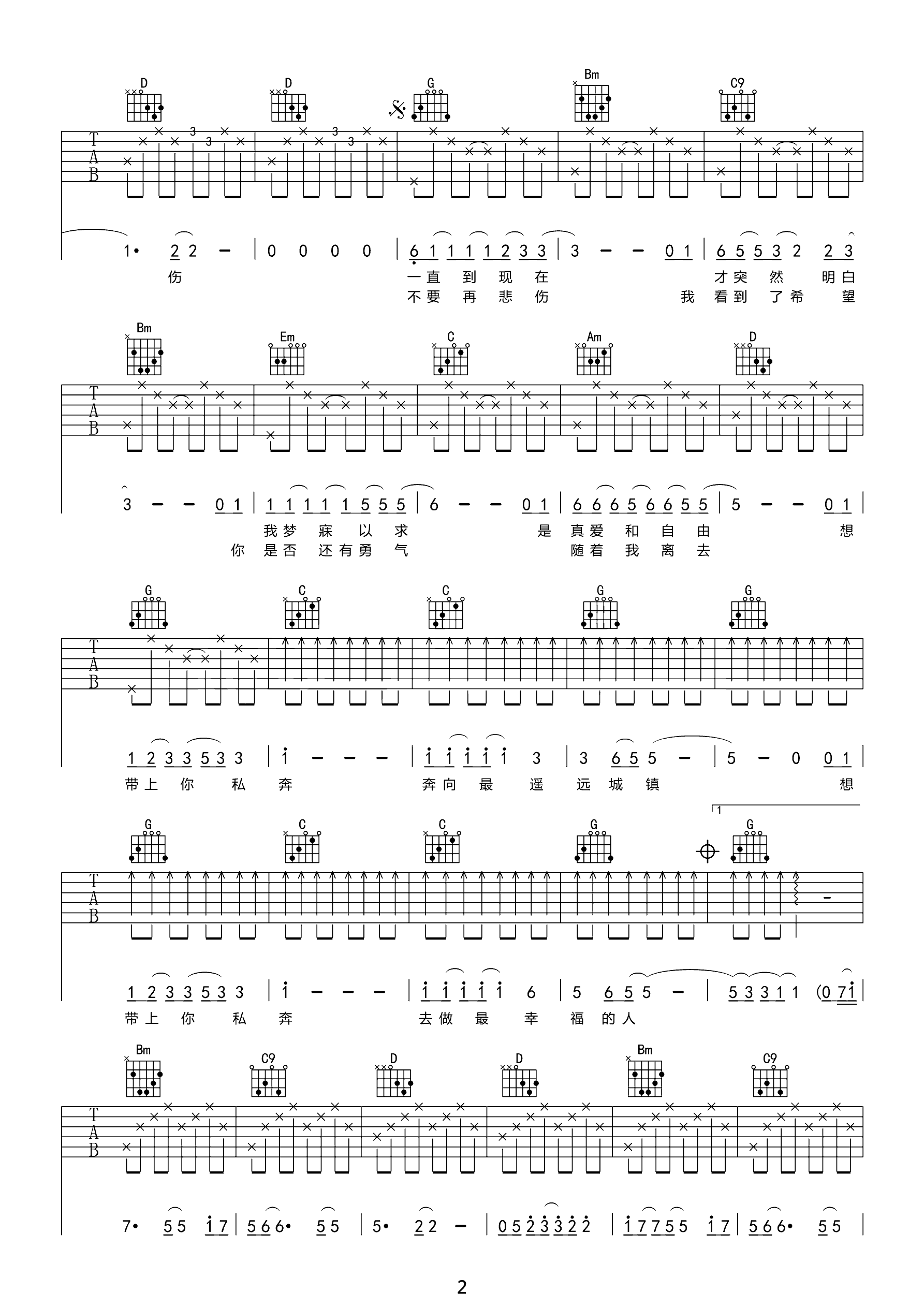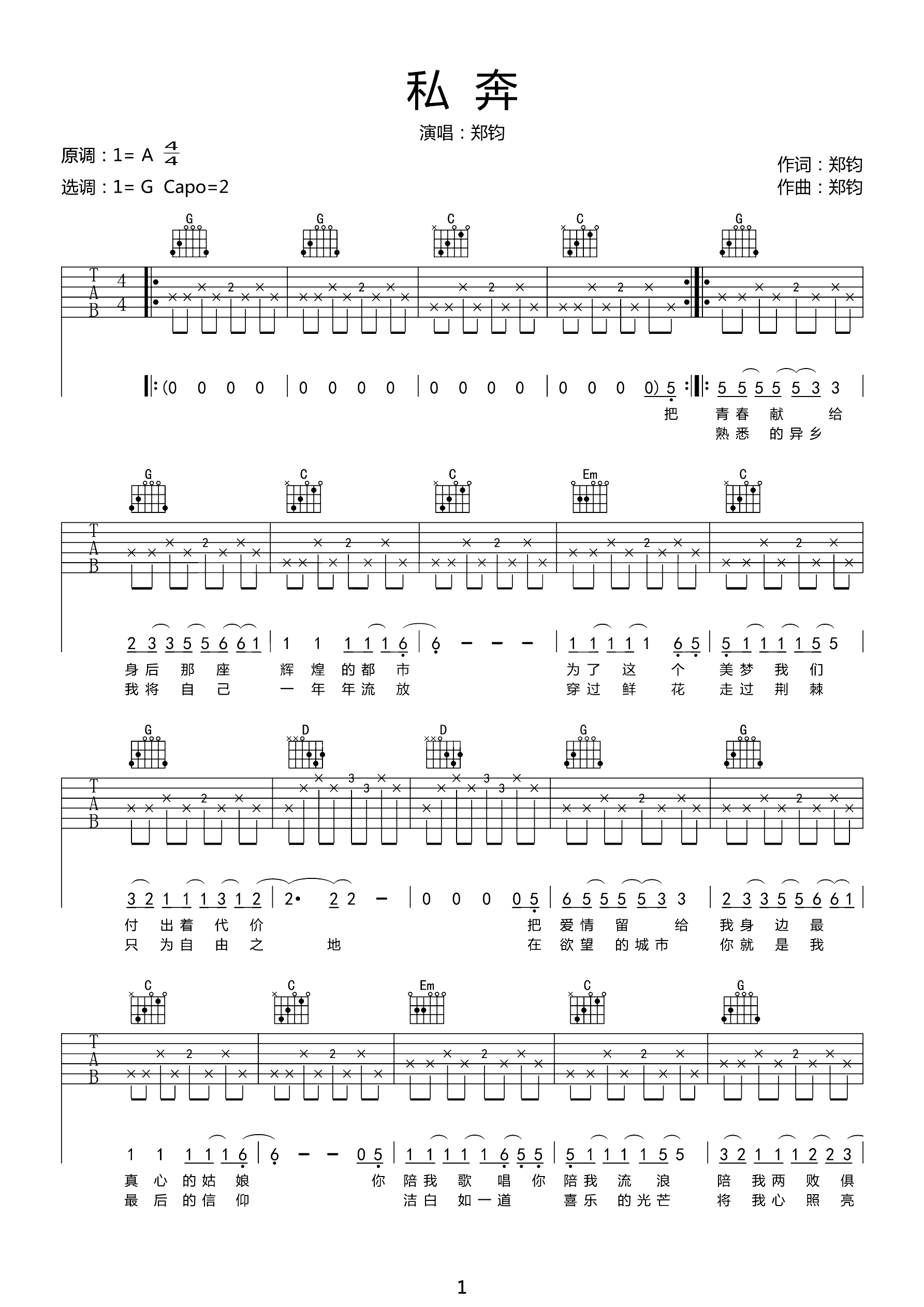 吉他谱 | 郑钧《私奔》