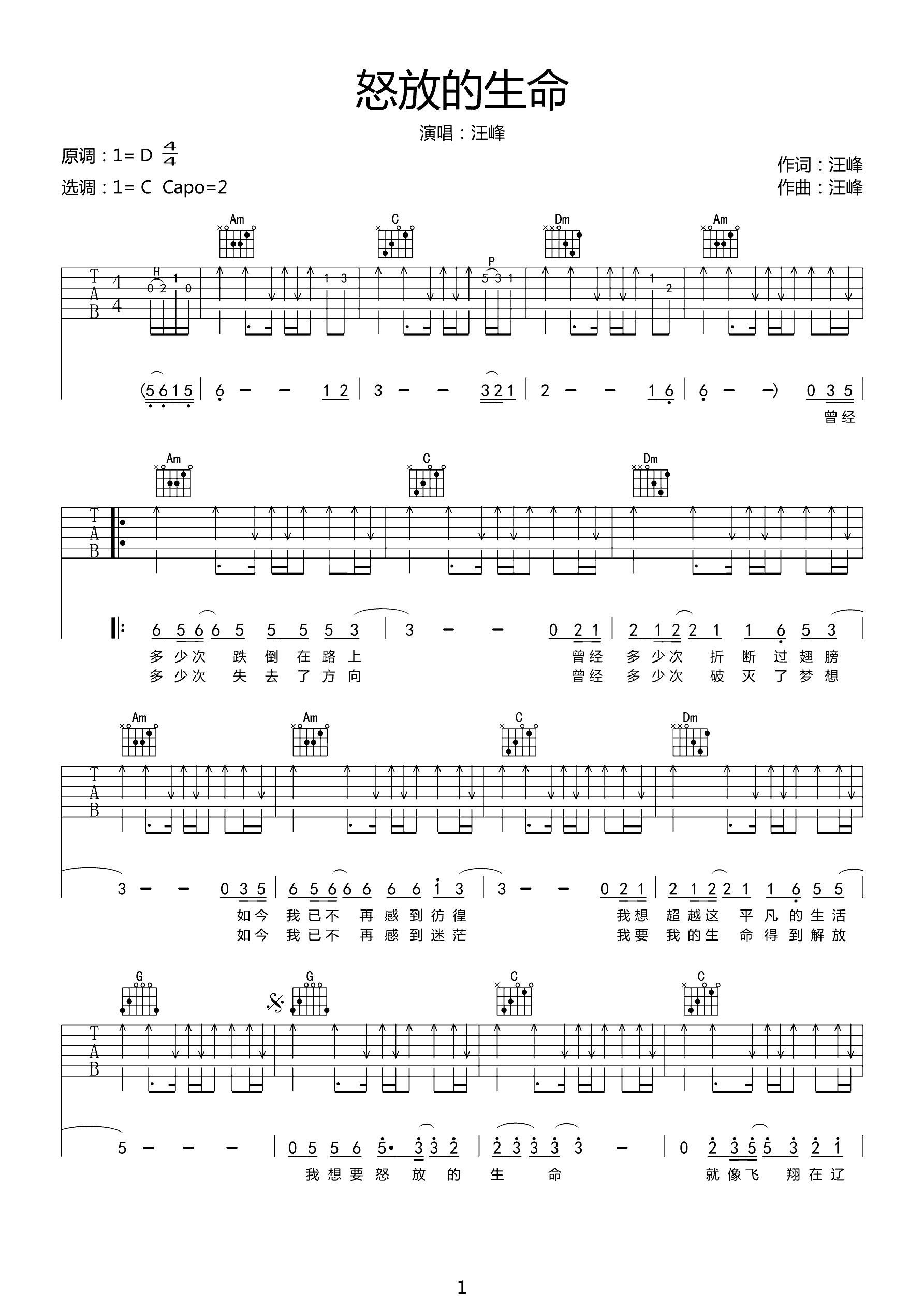 吉他谱 | 热门弹唱《怒放的生命》