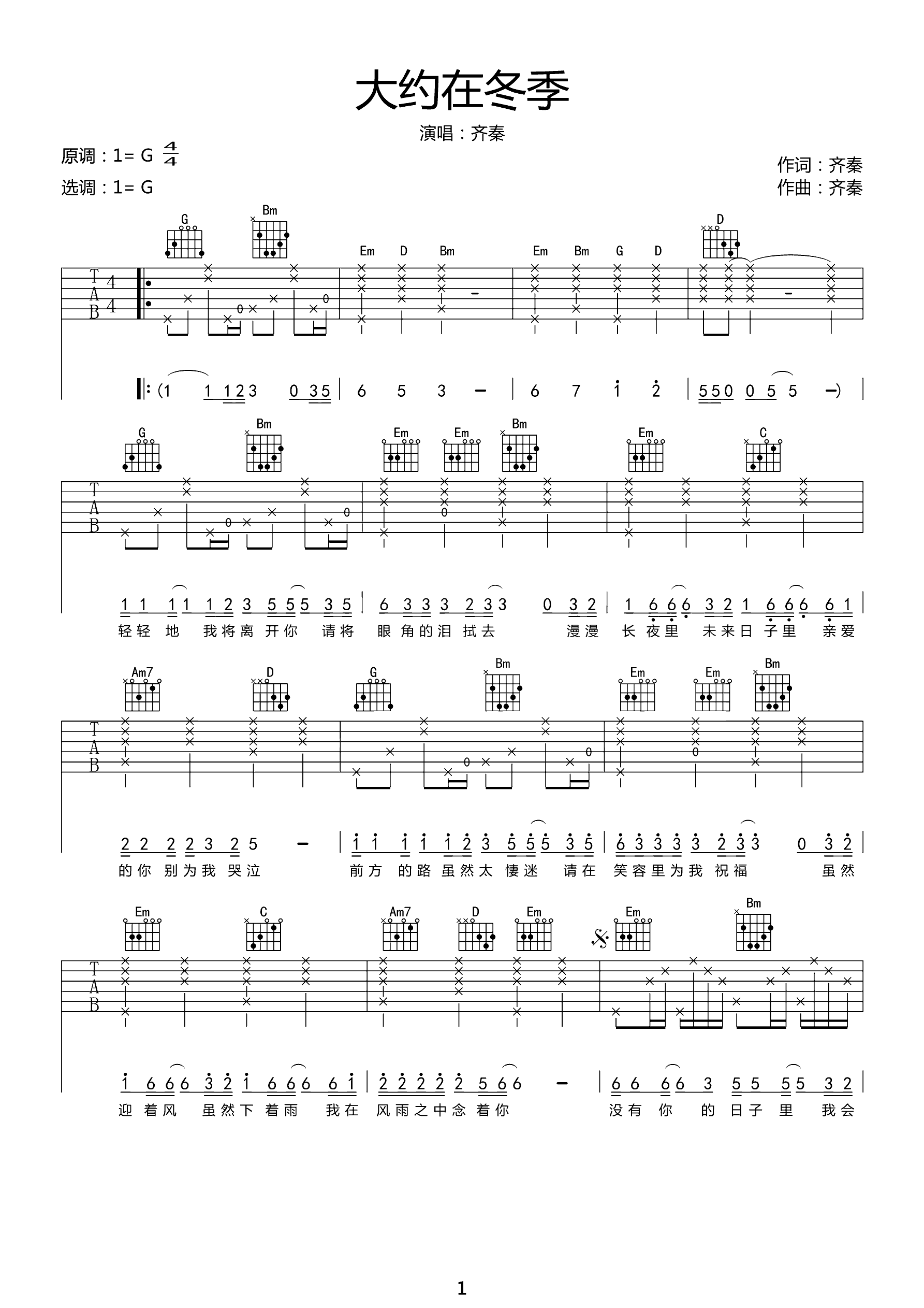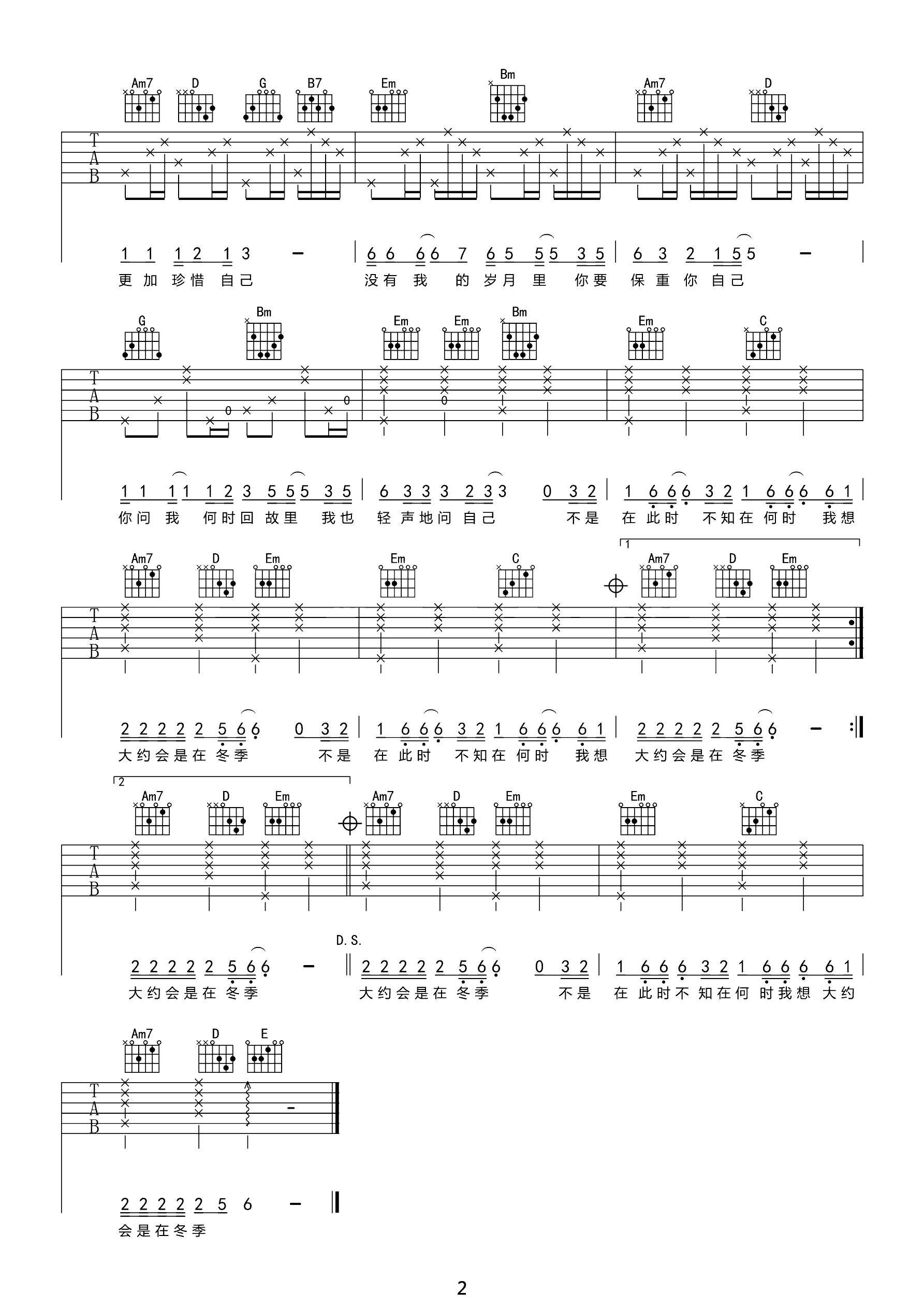 吉他谱 | 热门弹唱《大约在冬季》