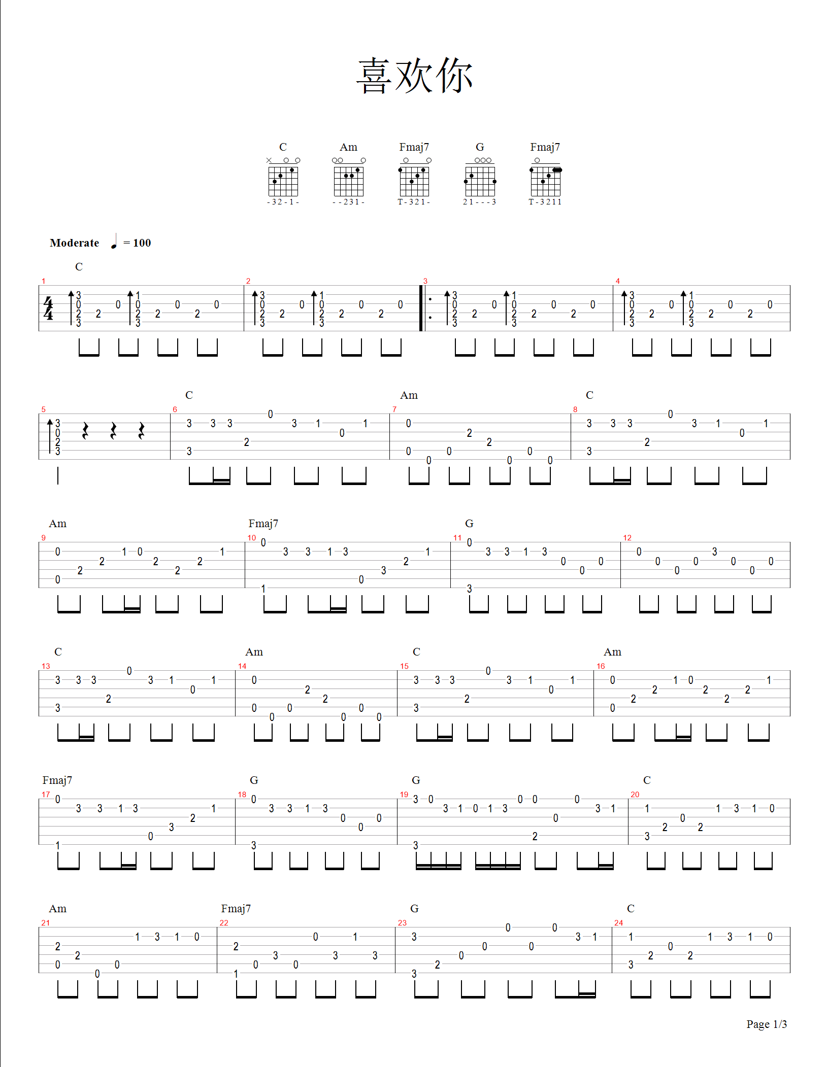 吉他谱 | 经典指弹《喜欢你》