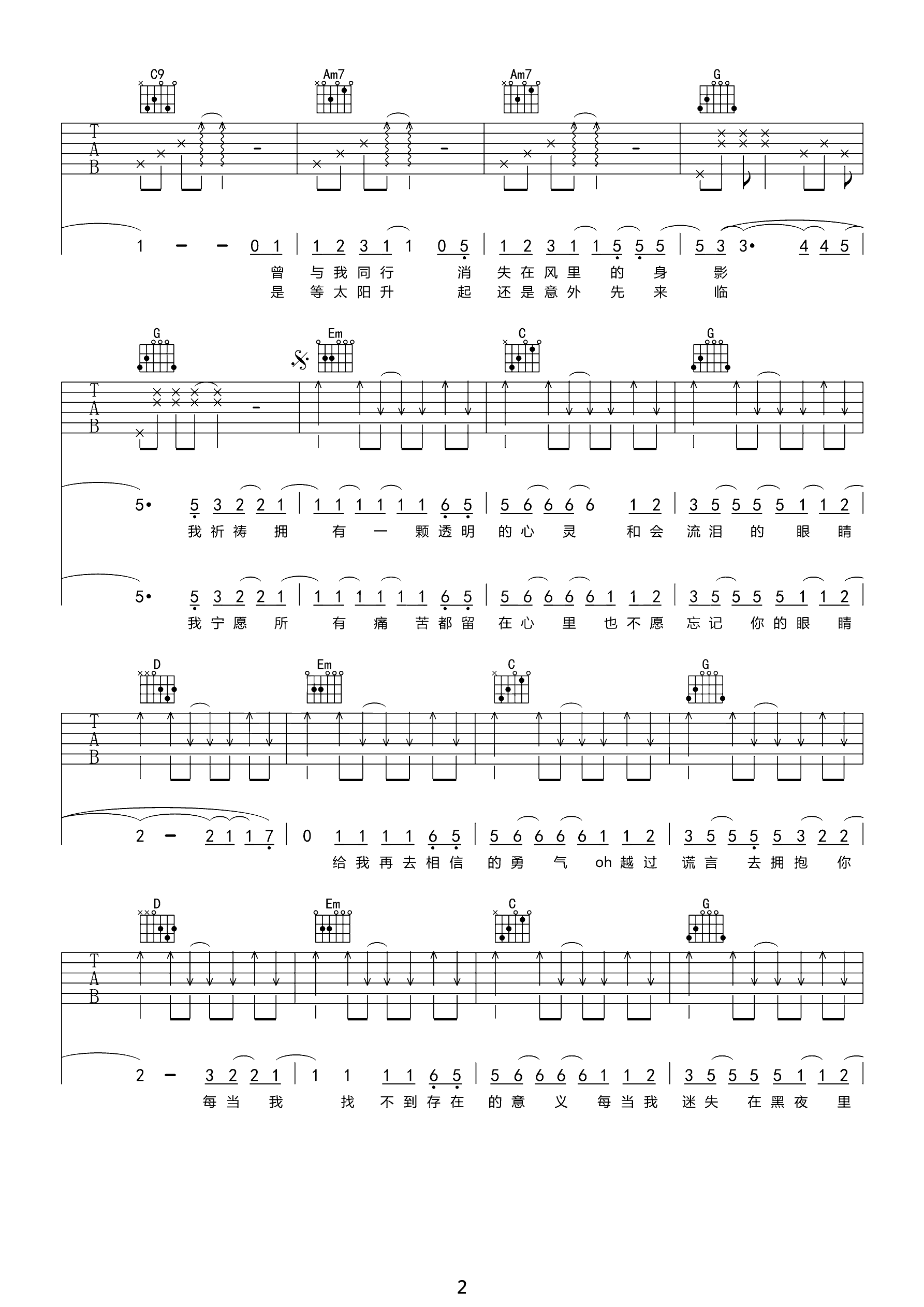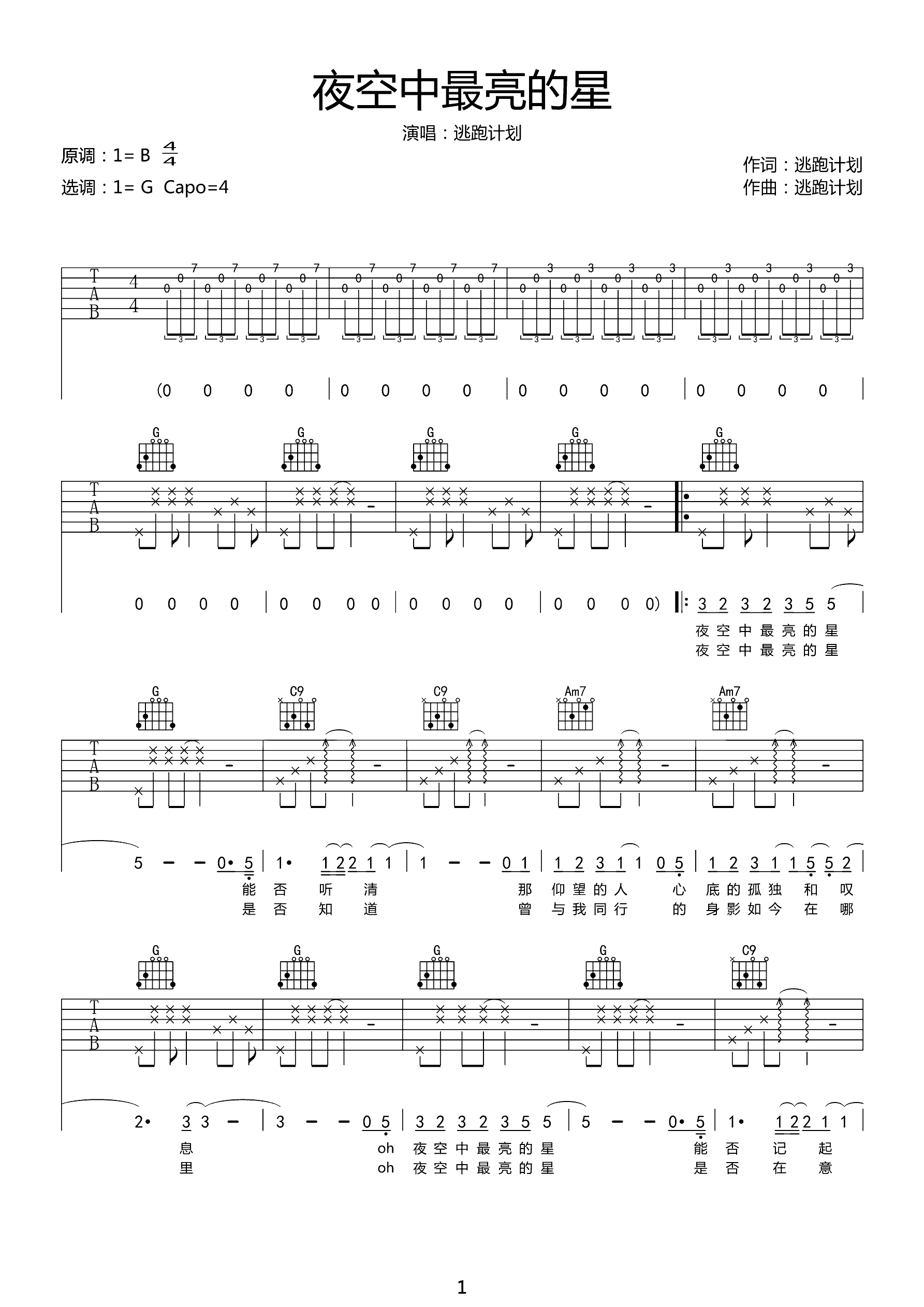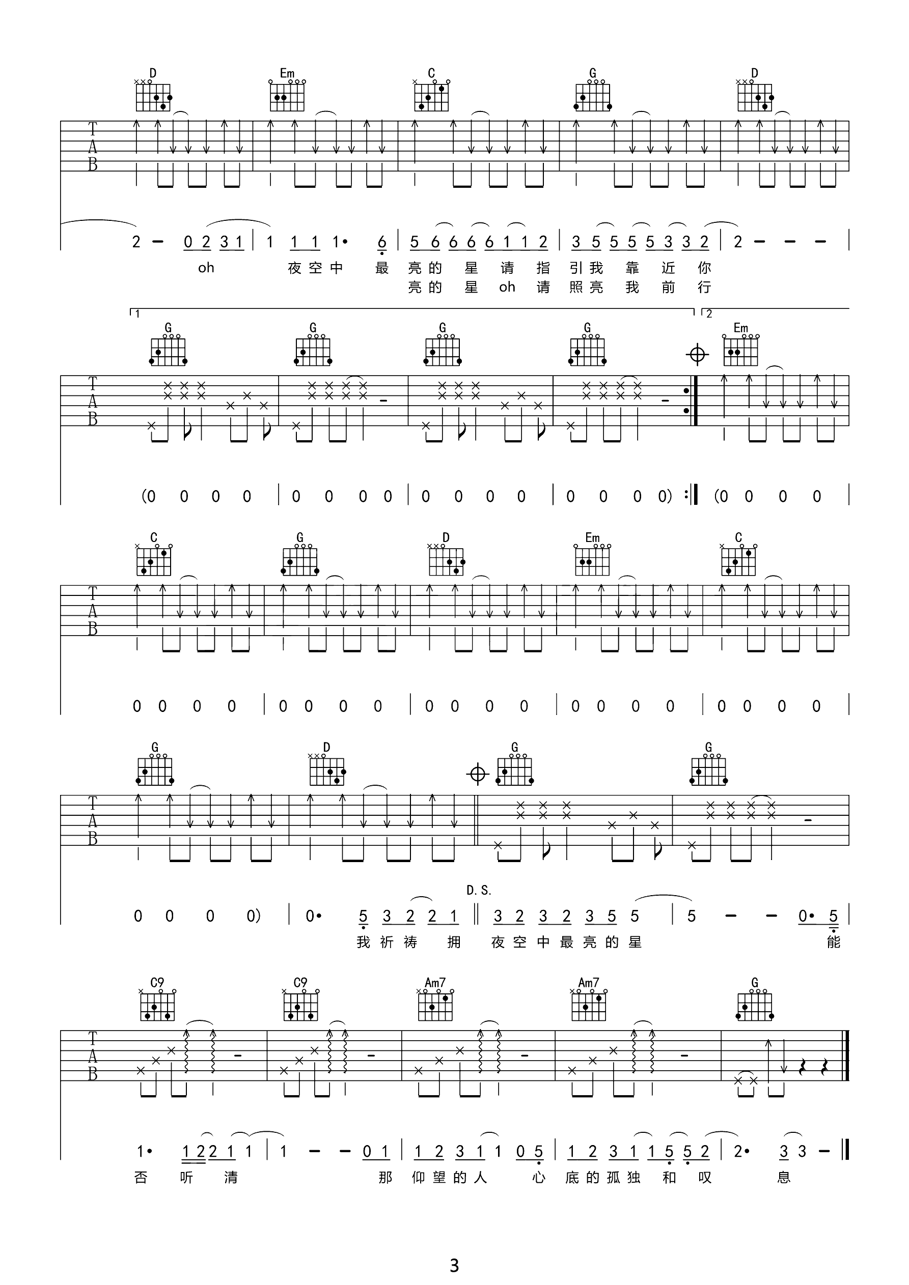 吉他谱 | 热门弹唱《夜空中最亮的星》