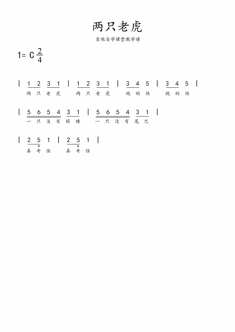 吉他谱 | 简谱《两只老虎》