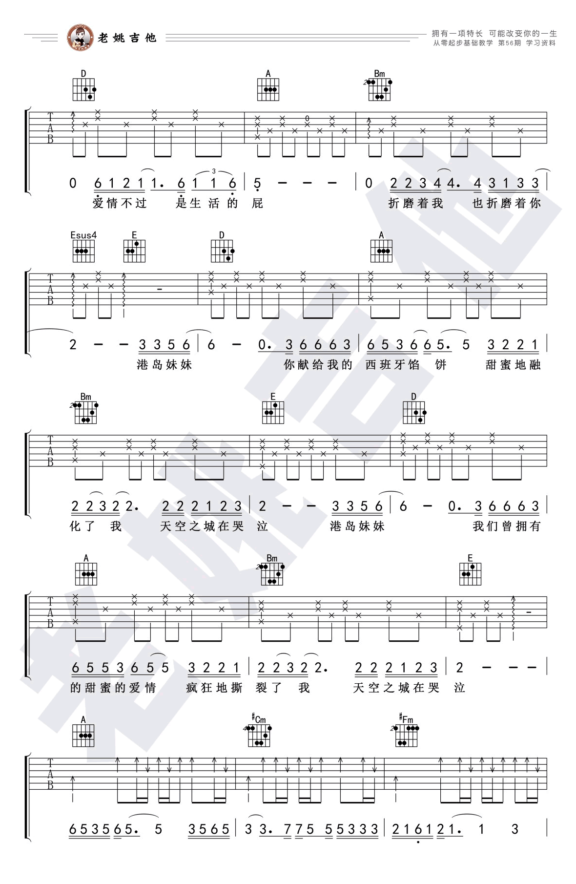 《天空之城》吉他谱,中国好声音蒋敦豪演唱的一首民谣歌曲,天空之城六线谱,A调弹唱谱,老姚吉他编配,网友整理分享。随谱附上《天空之城》吉他弹唱教学视频,本期从零起步基础教学配合歌曲讲解A调练习,琴友们跟随老师的讲解示范学习。