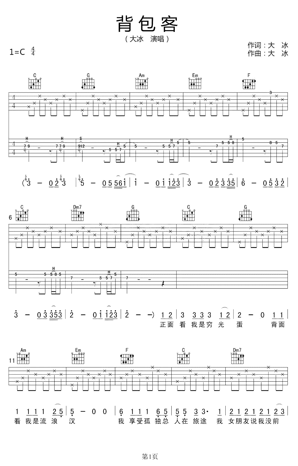 背包客吉他谱 大冰 C调弹唱谱 高清图片谱