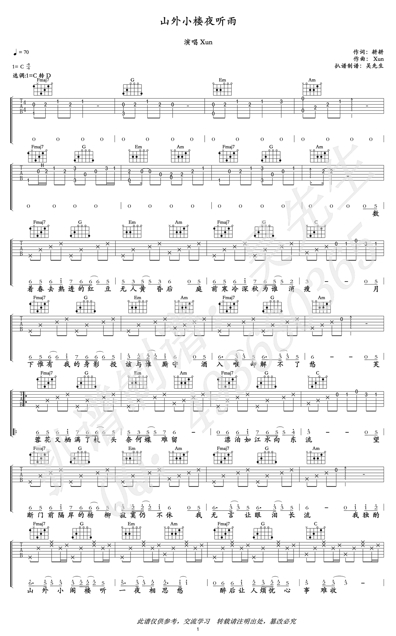山外小楼夜听雨吉他谱 Xun C调弹唱谱 高清六线谱