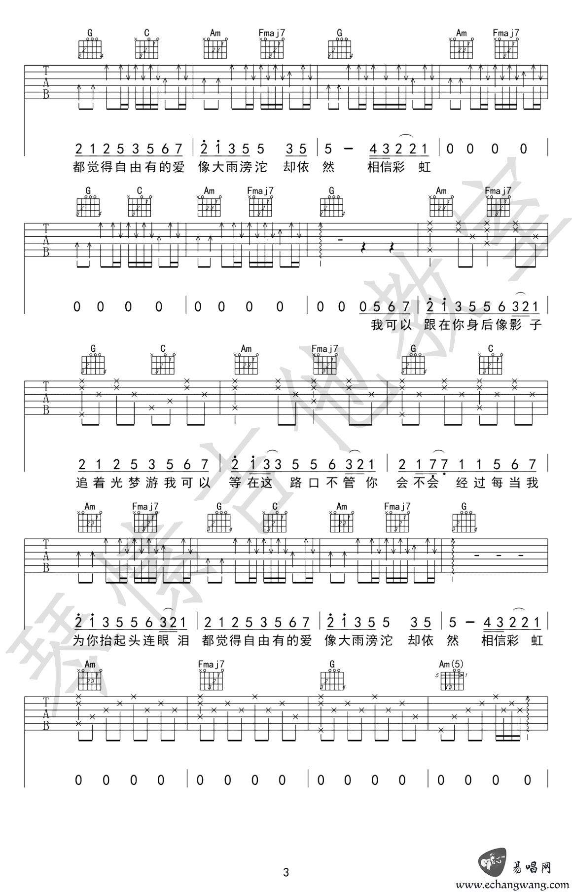 追光者吉他谱 C调弹唱谱 岑宁儿《追光者》六线谱